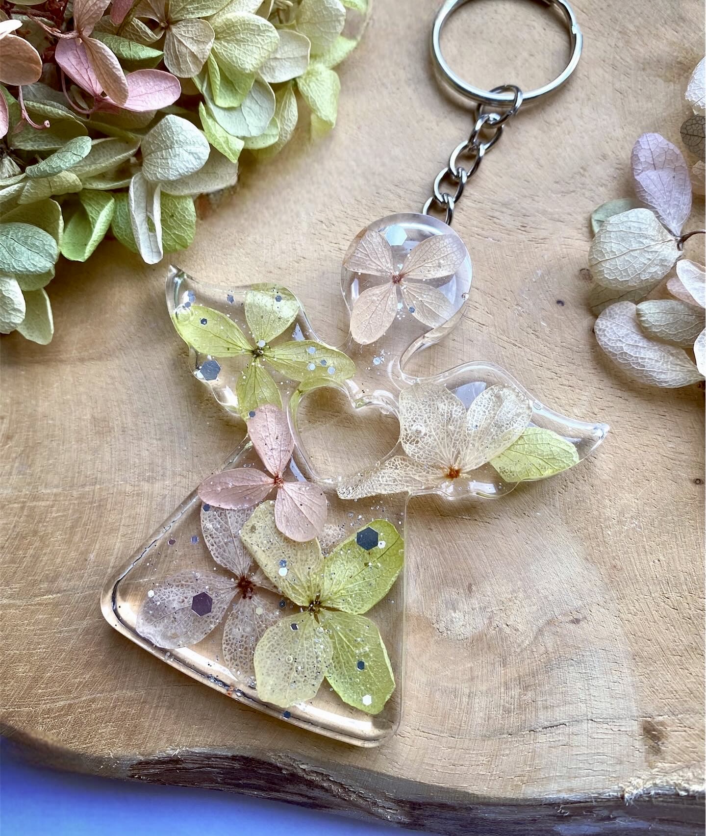 Klíčenka ve tvaru Anděla s pravými sušenými květy zelené Hortenzie.Velikost: 7,4 cm.Barva řetízku a kroužku: stříbrná