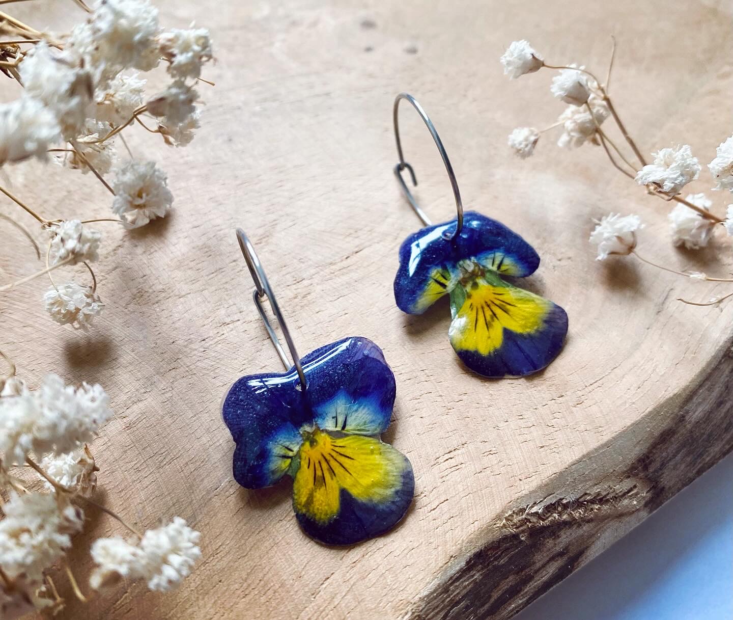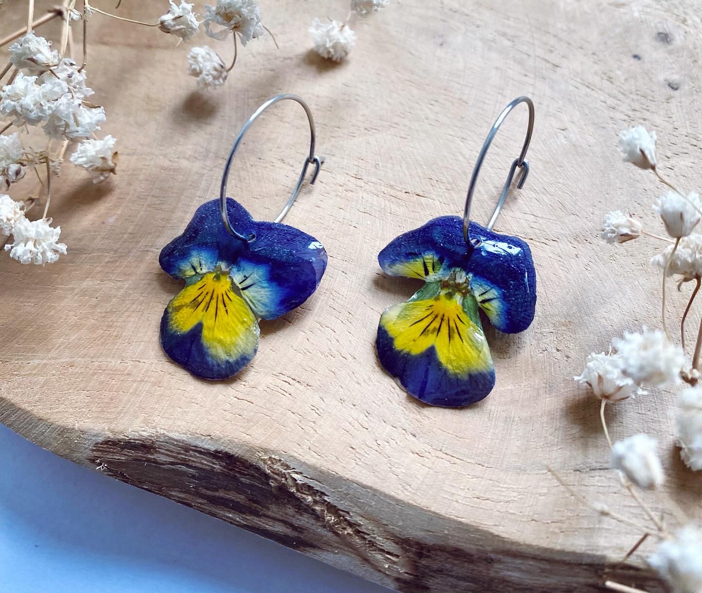 Náušnice celé květy s pravými sušenými květy Macešky.Velikost: 2,2 cm.Kruhy: chirurgická ocel.