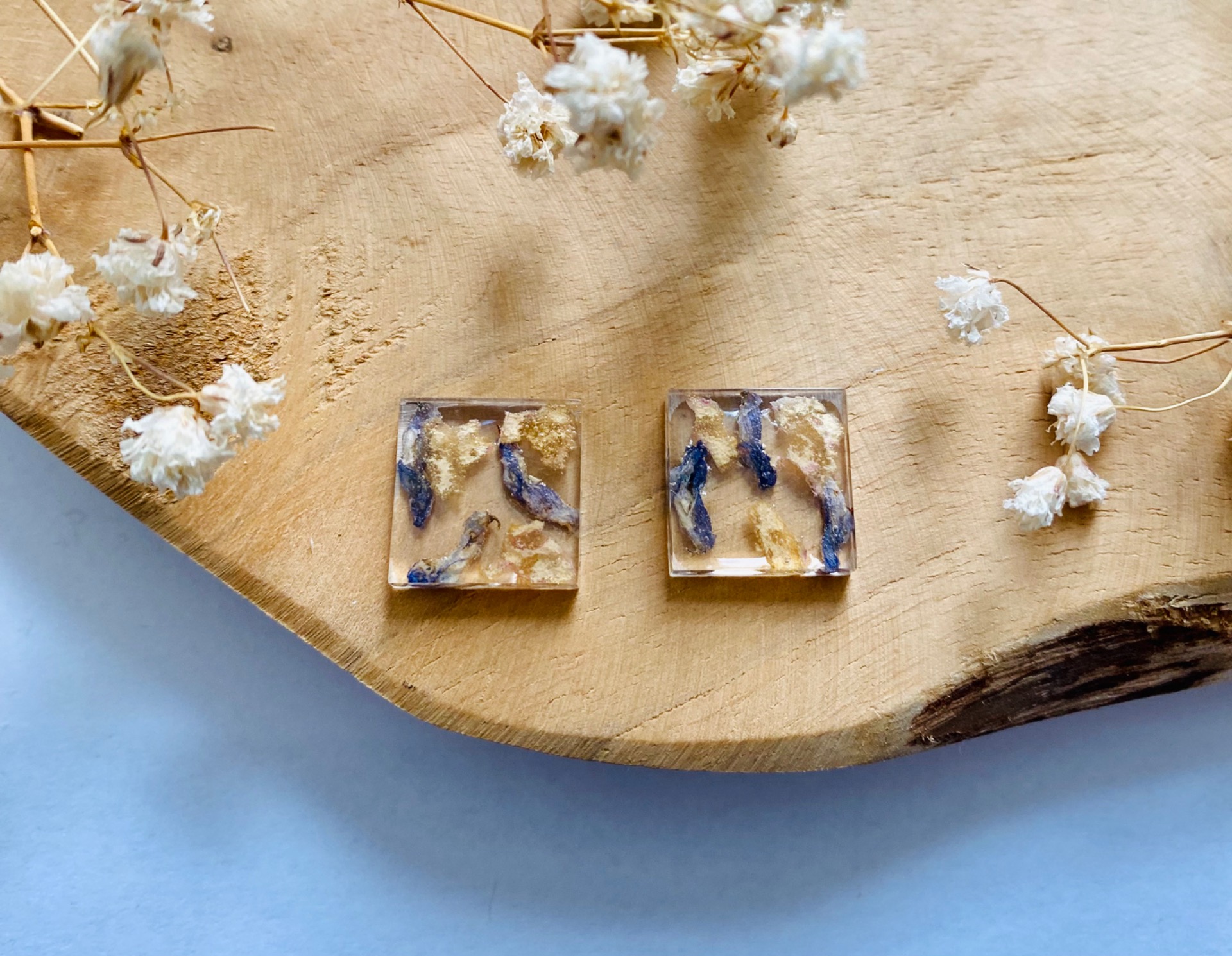 Náušnice malé čtverce s pravými sušenými květy.
