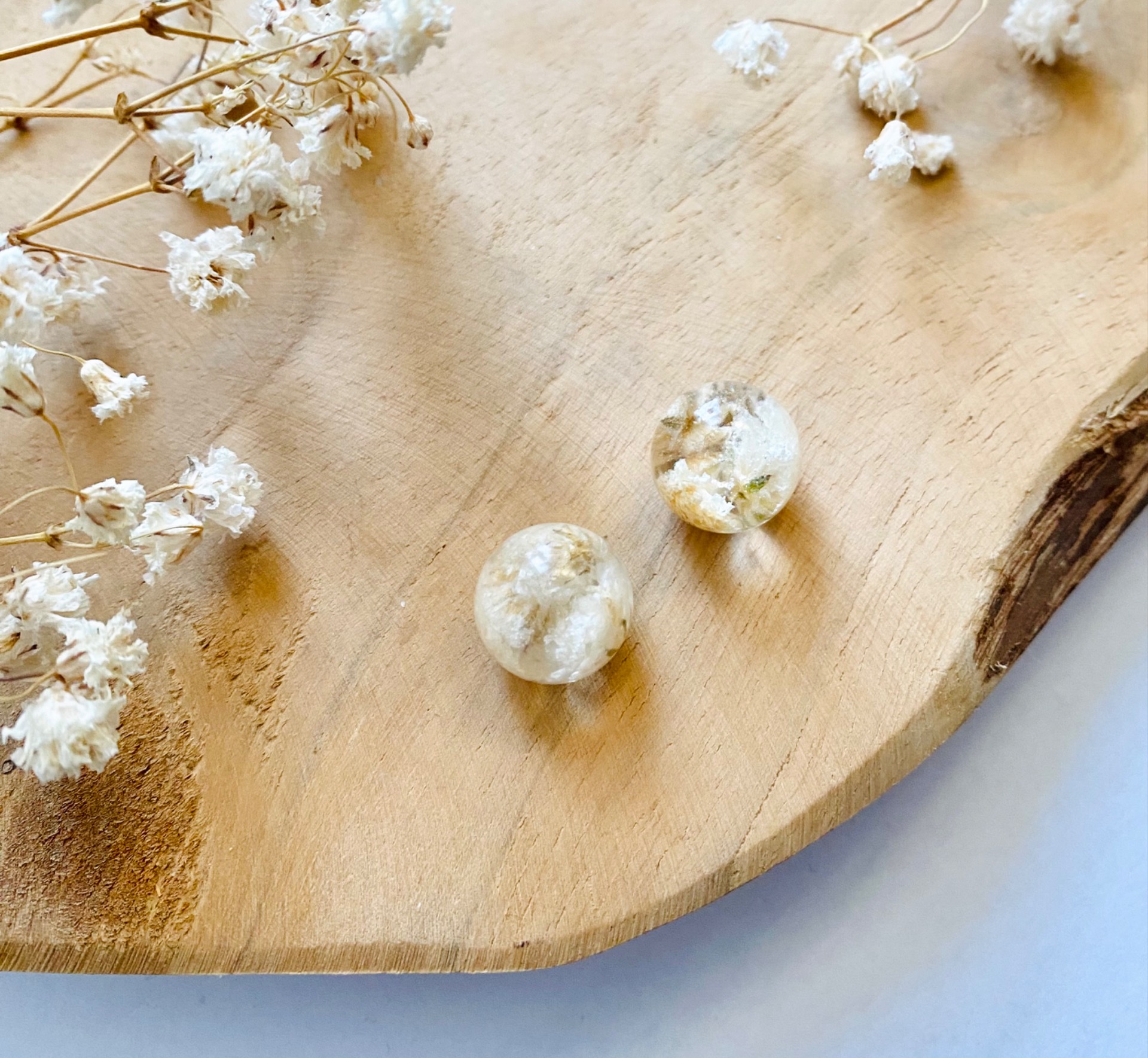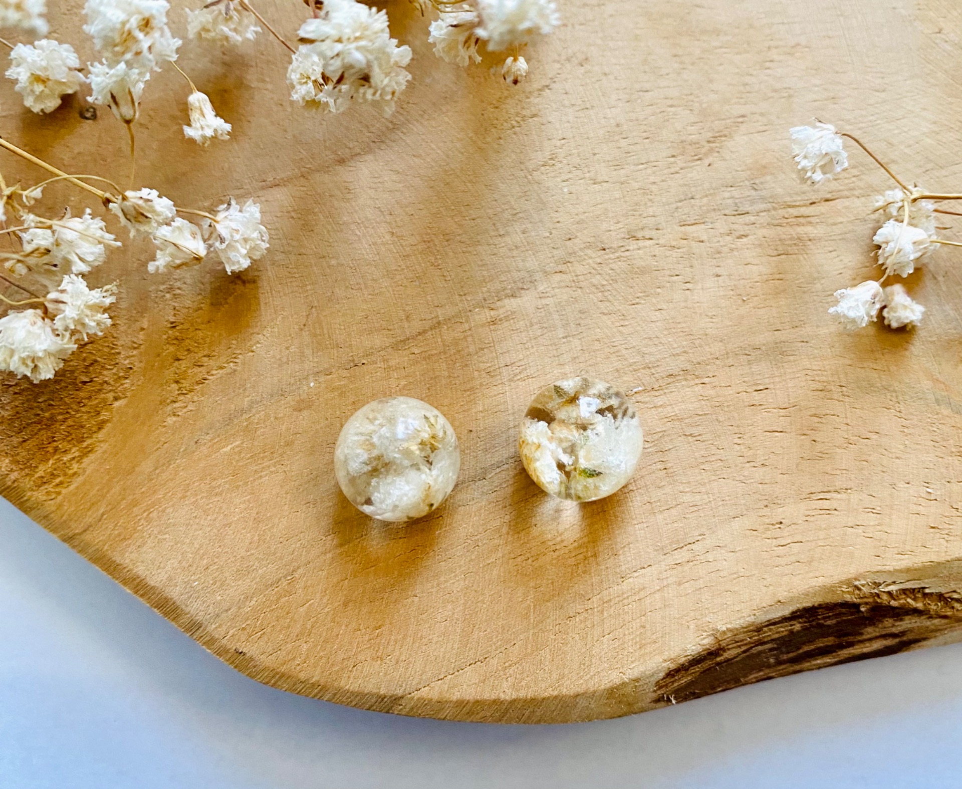 Náušnice koule s pravými sušenými květy Gypsophila.Velikost: 1 cm.Puzety: chirurgická ocel.