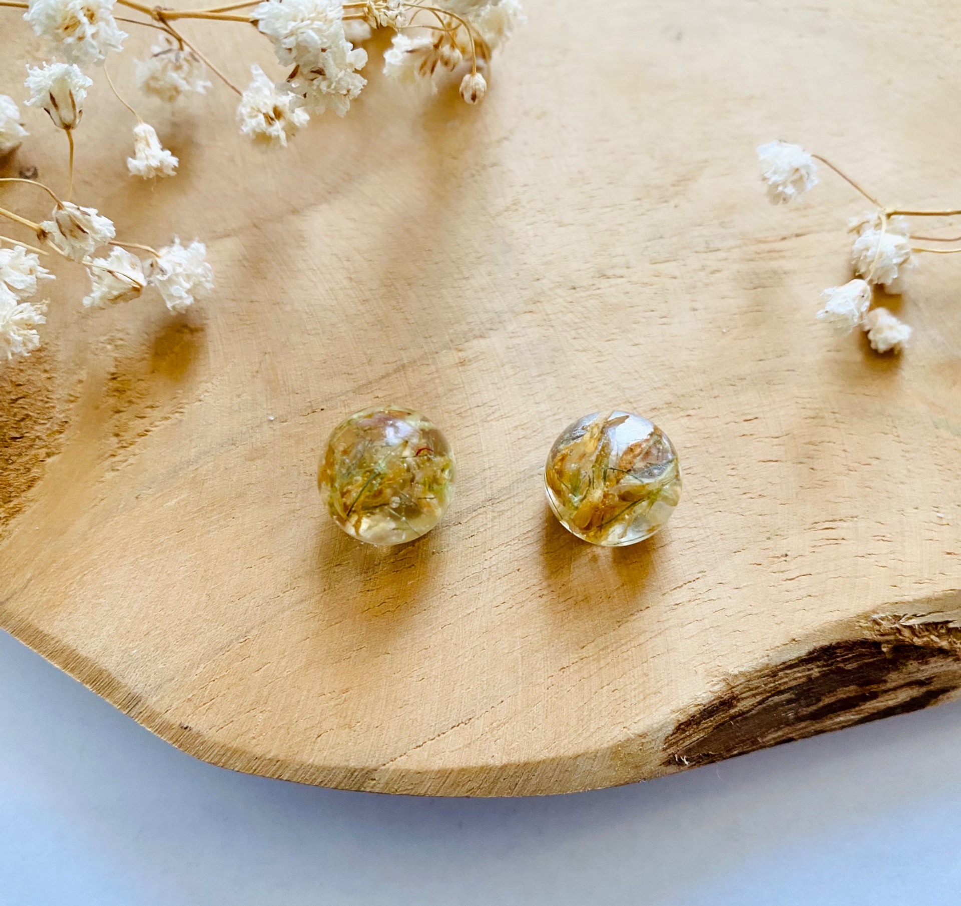 Náušnice koule s pravými sušenými květy.Velikost: 1 cm.Puzety: chirurgická ocel.