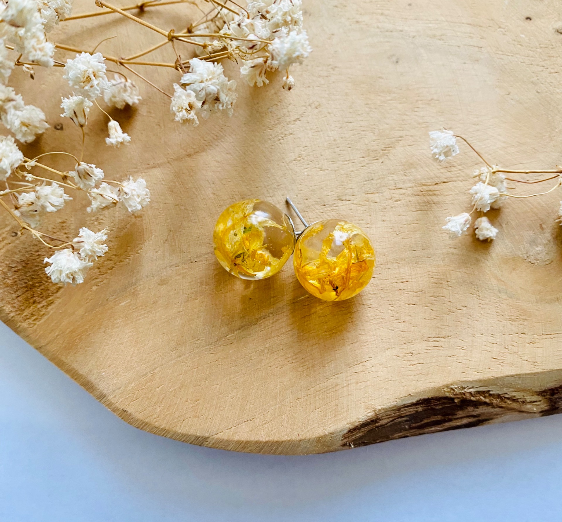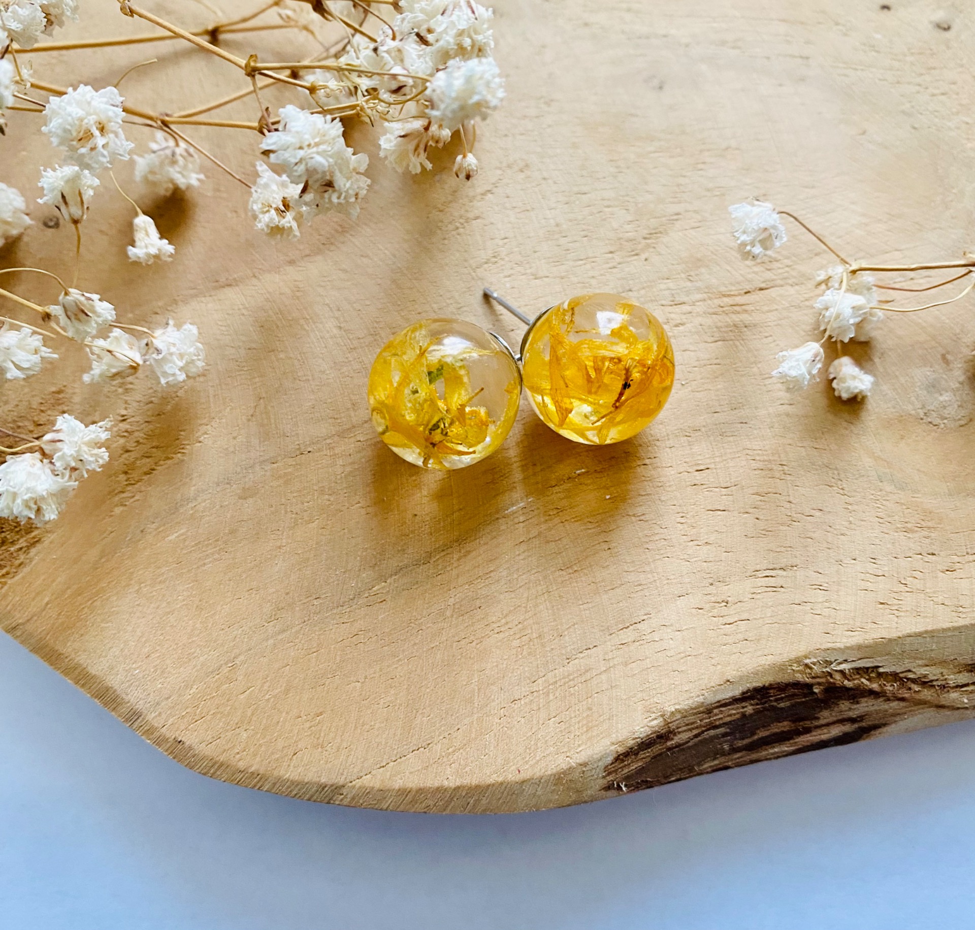 Náušnice koule s pravými sušenými květy Měsíčku.Velikost: 1,2 cm.Puzety: chirurgická ocel.