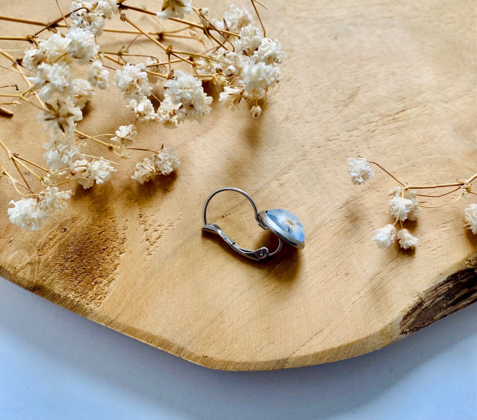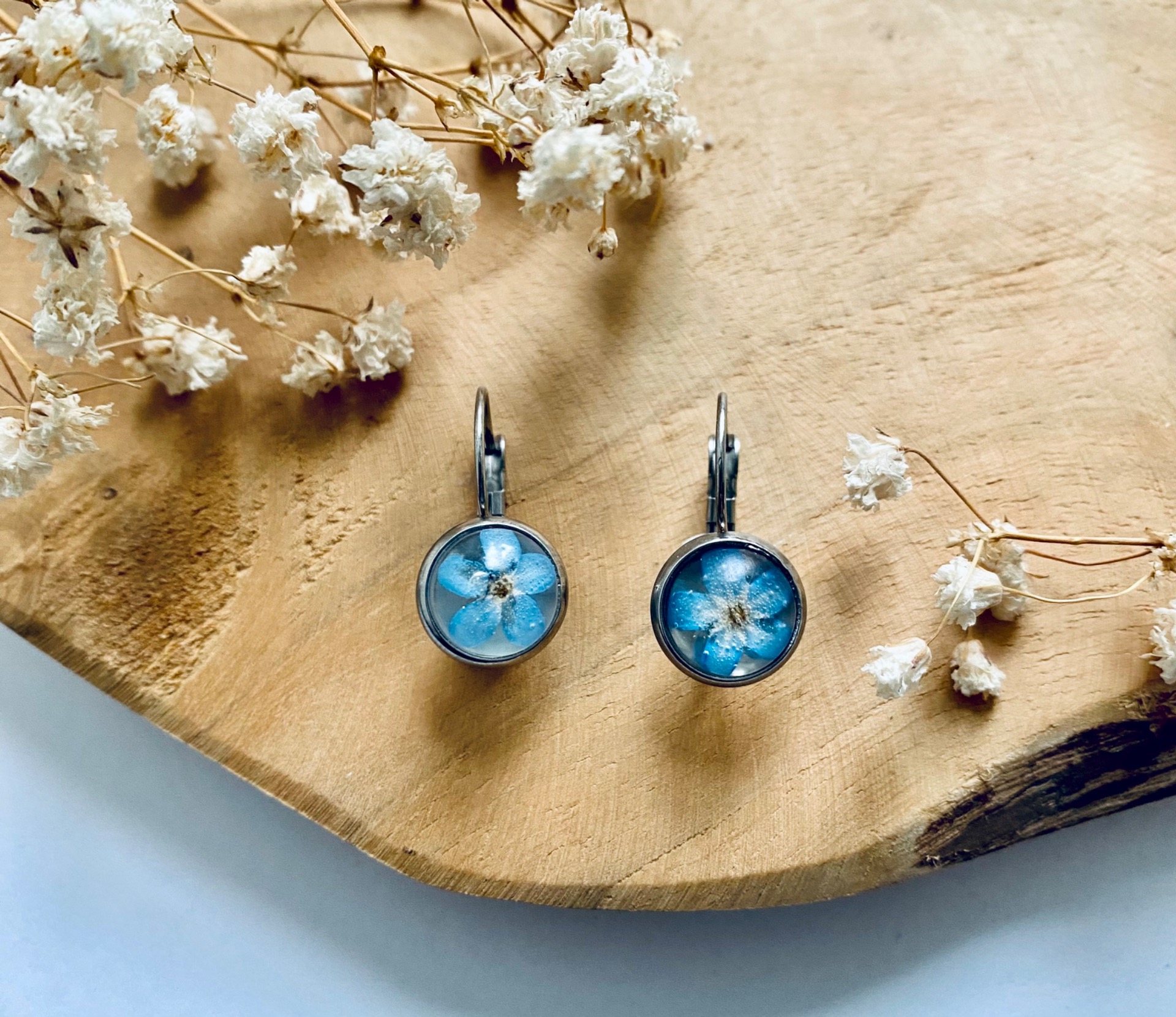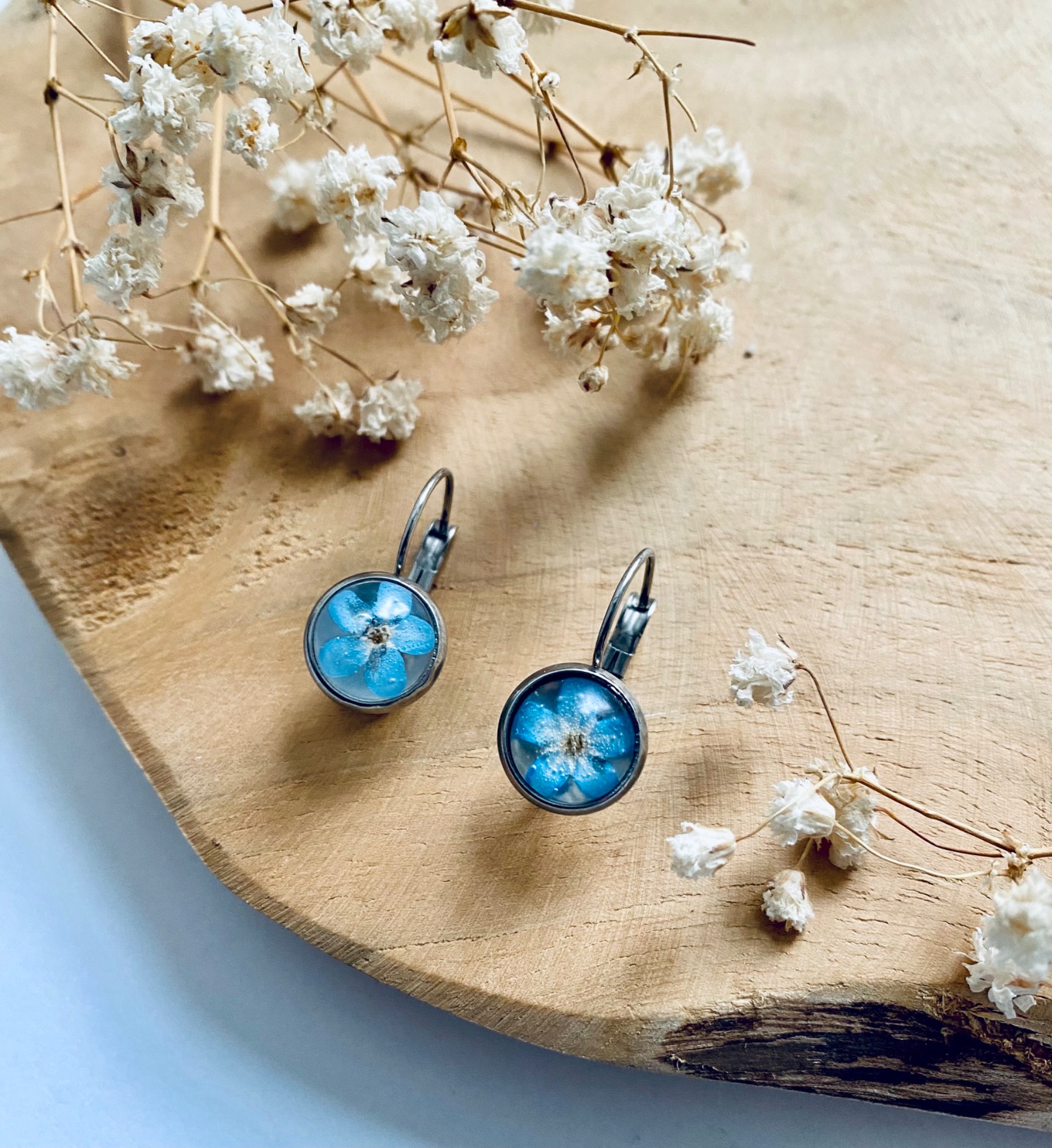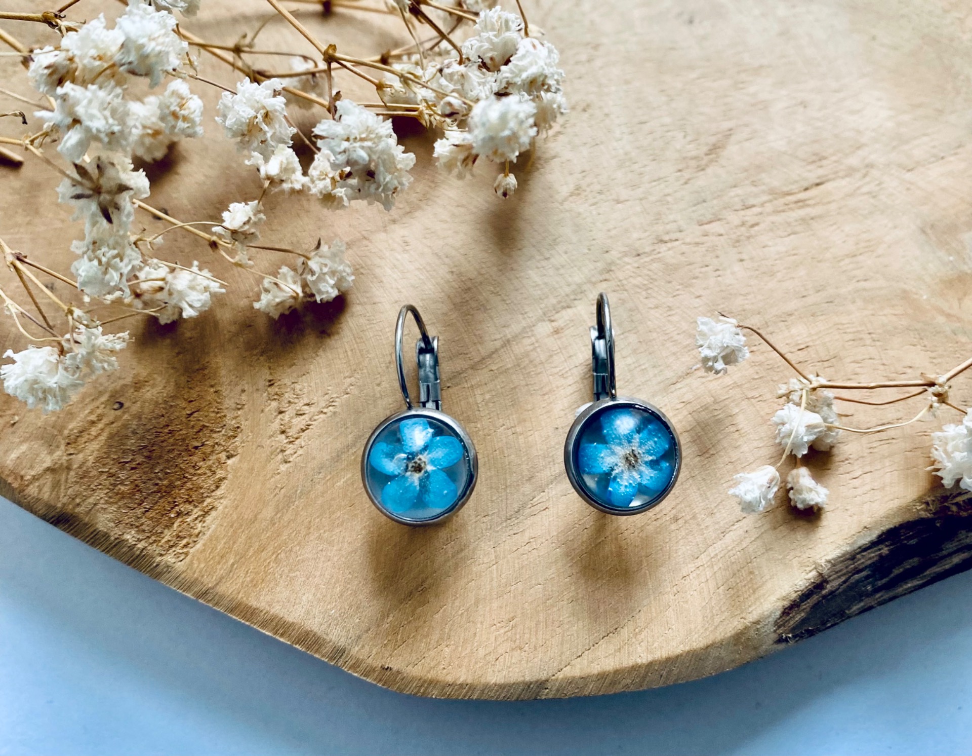 Náušnice kruhové s pravými sušenými květy Pomněnek.Velikost půlkuliček: 12 mm.Náušnice: chirurgická ocel.