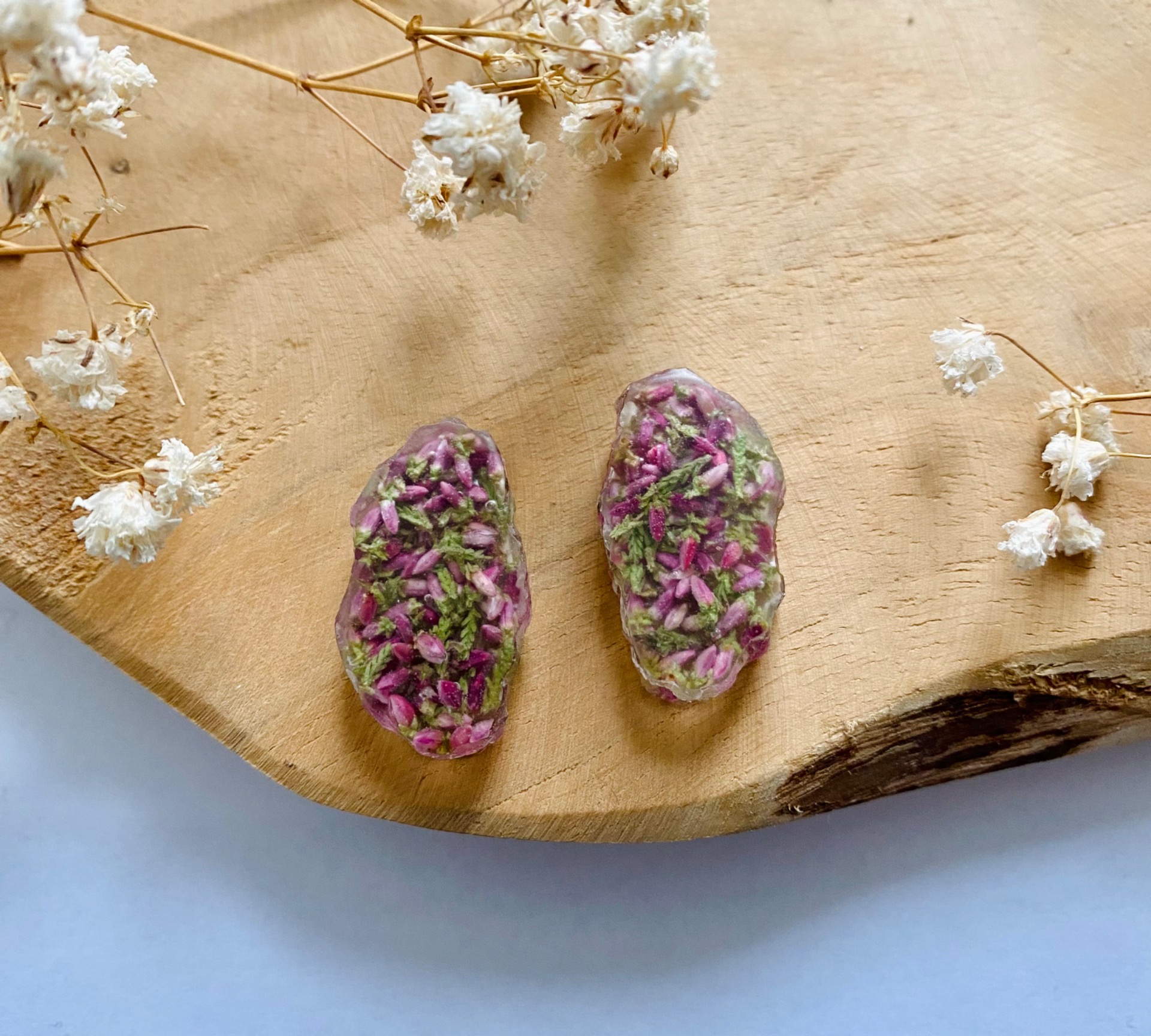 Náušnice magické krystaly s pravými sušenými květy růžového Vřesu.Velikost: 2,7 cm.Puzety: Chirurgická ocel.