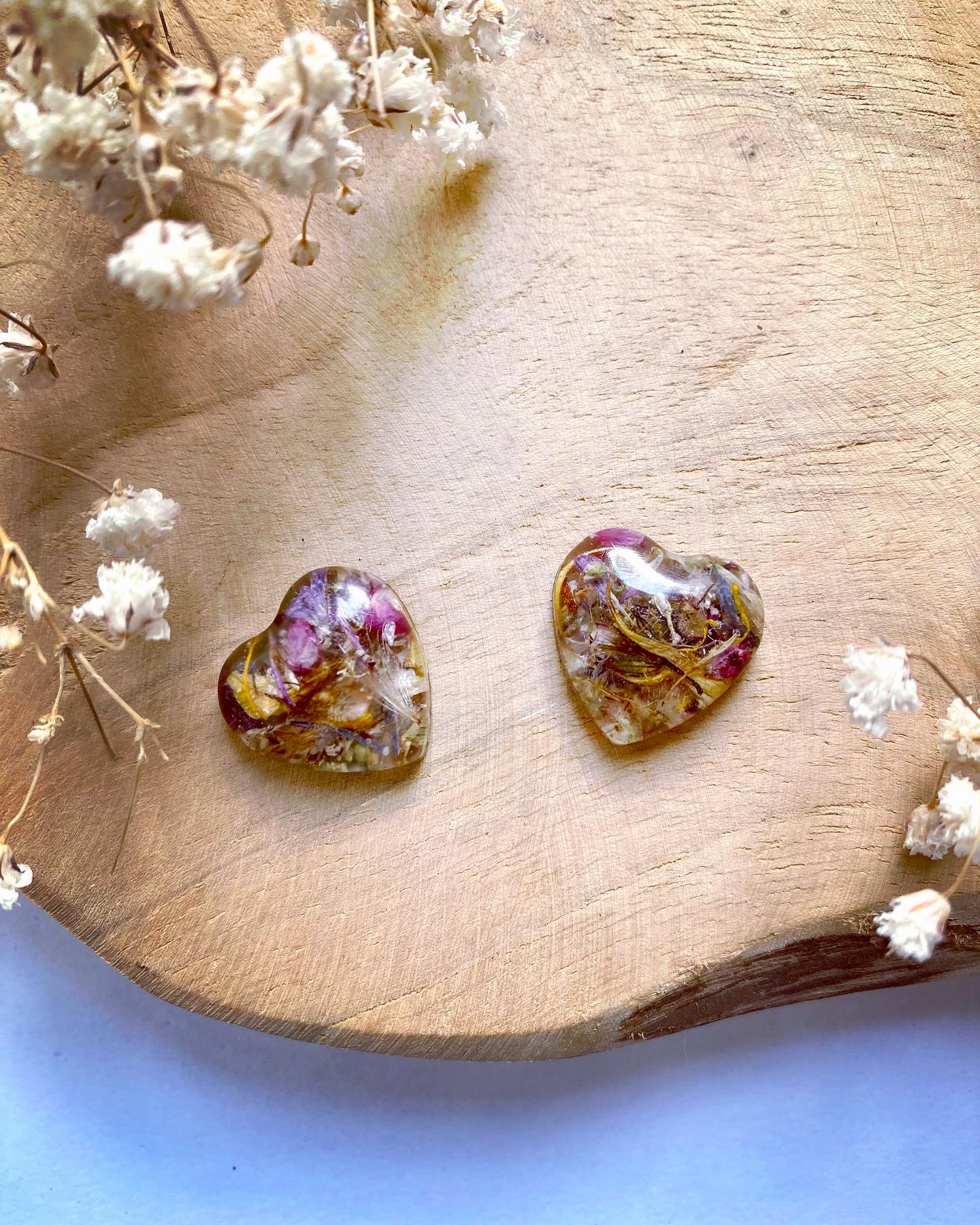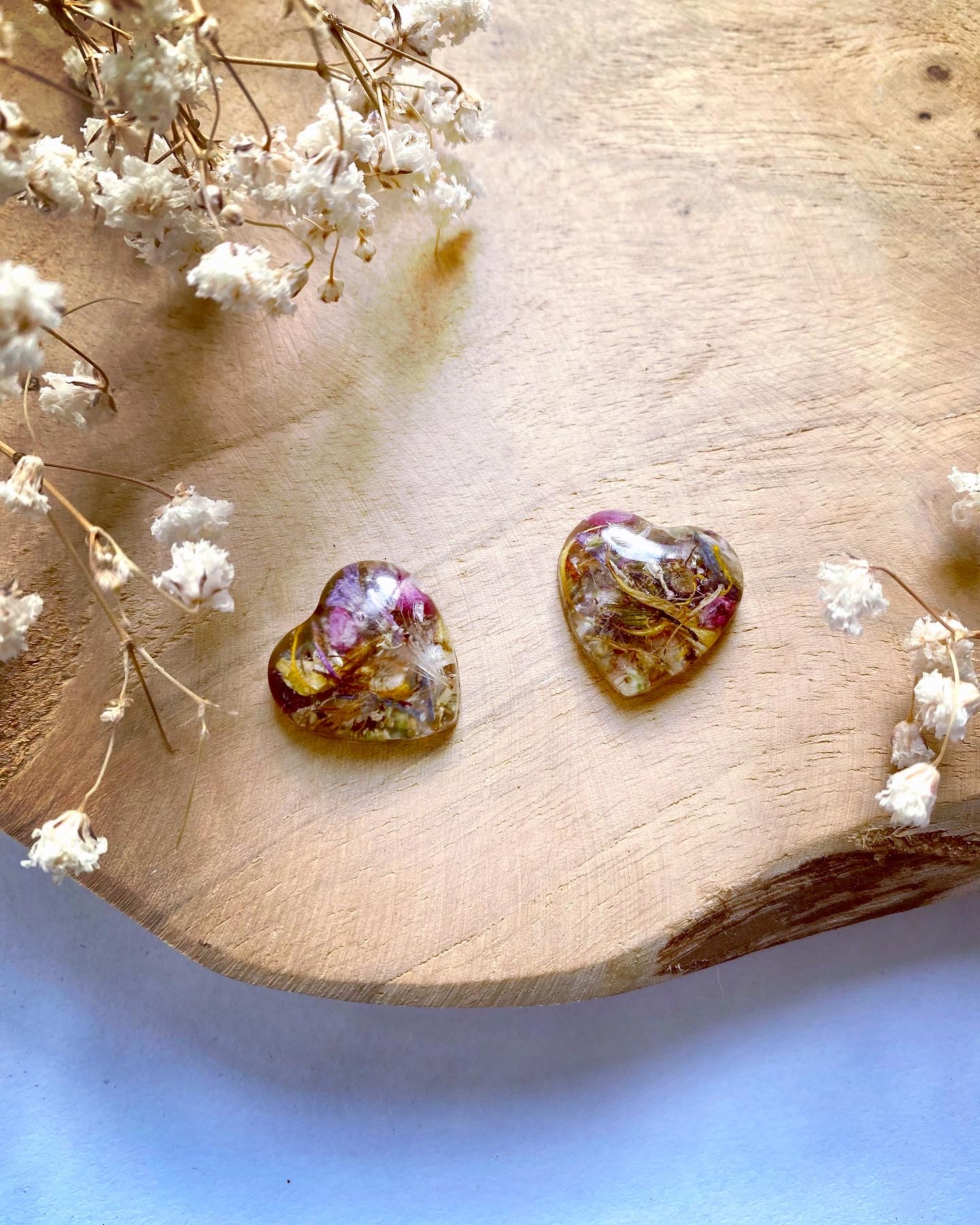 Náušnice malá srdíčka s pravými sušenými květy lučního kvítí.Velikost: 1,8 cm.Puzety: Chirurgická ocel.
