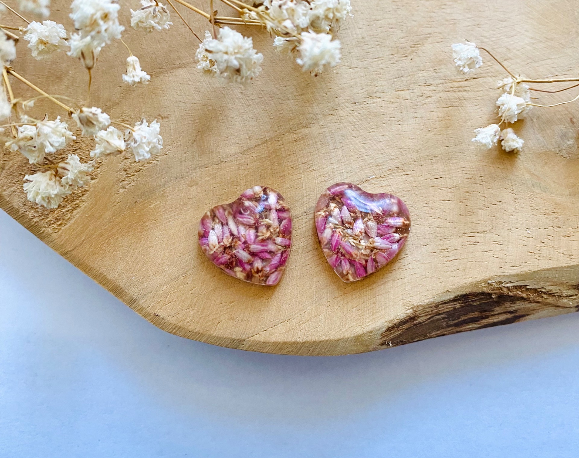 Náušnice malá srdíčka s pravými sušenými květy růžového Vřesu.Velikost: 1,8 cm.Puzety: Chirurgická ocel.