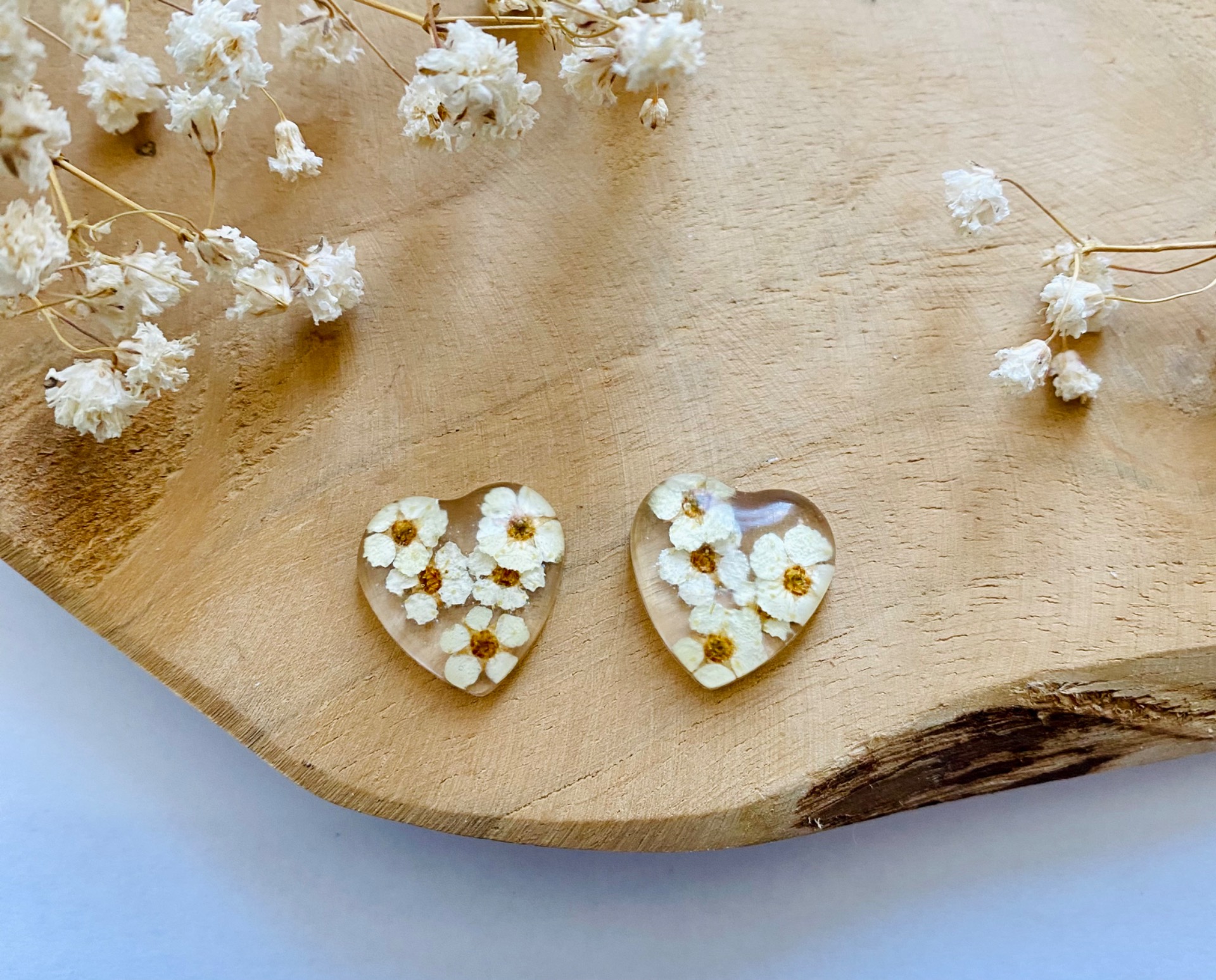 Náušnice malá srdíčka s pravými sušenými květy Tavolníku.Velikost: 1,8 cm.Puzety: Chirurgická ocel.