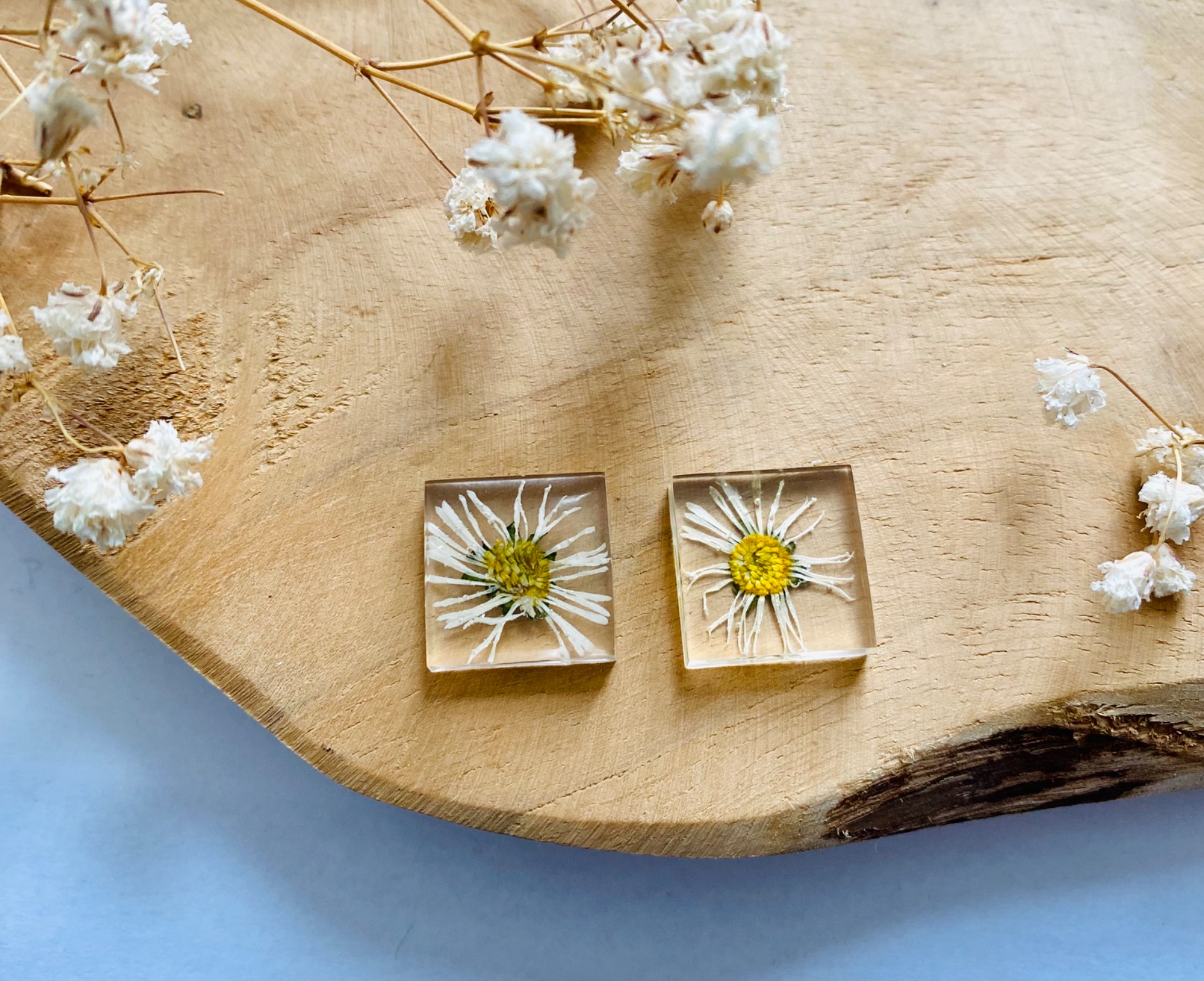 Náušnice malé čtverce s pravými sušenými květy Sedmikrásky.Velikost: 1,5 cm.Puzety: Chirurgická ocel.