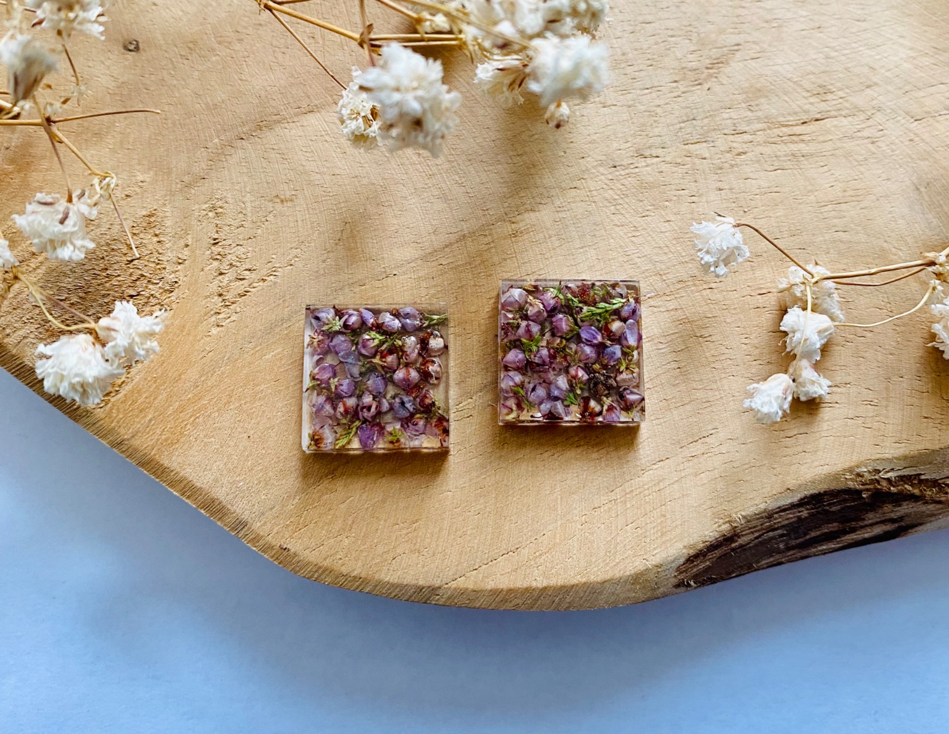 Náušnice malé čtverce s pravými sušenými květy.