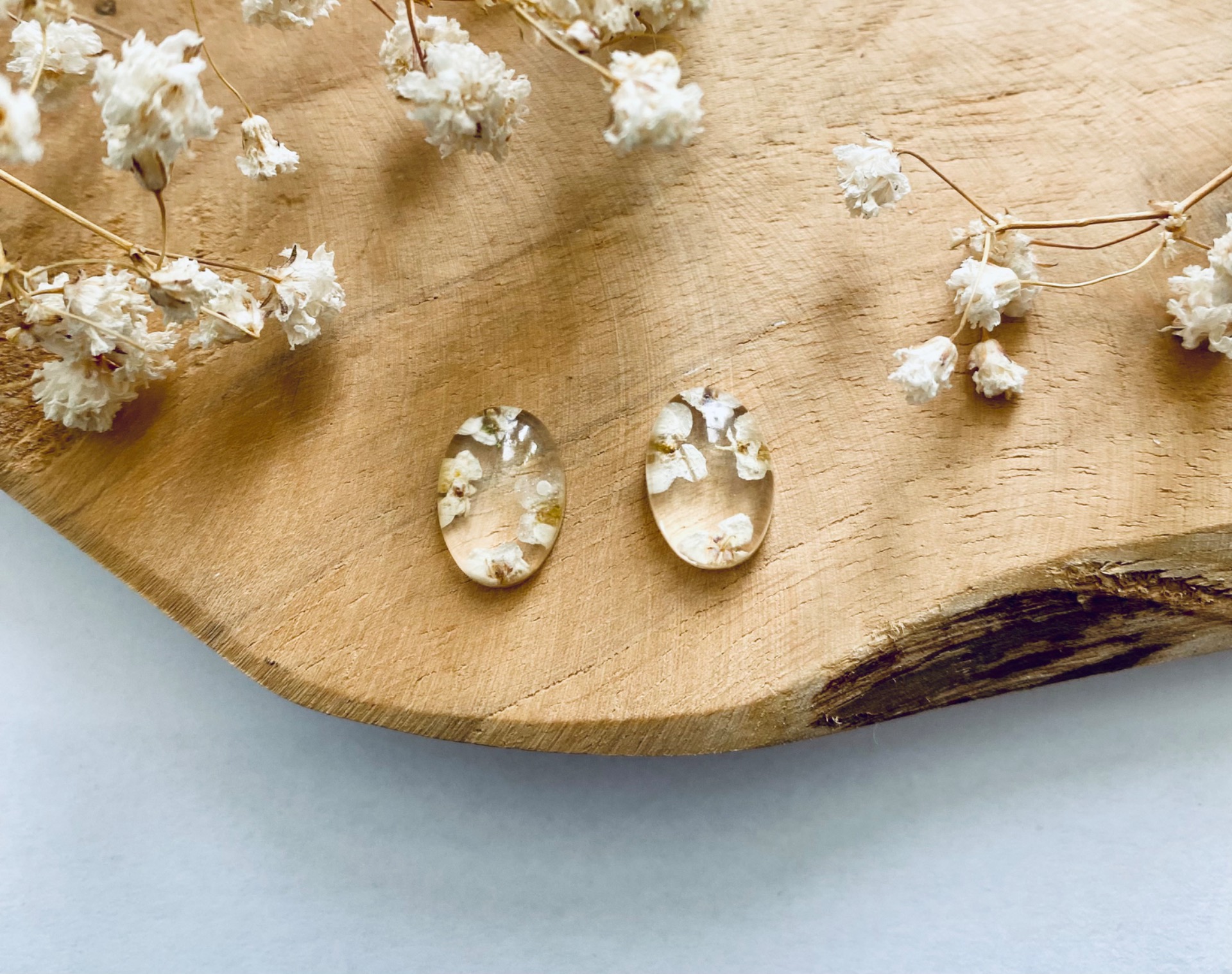 Náušnice malé ovály s pravými sušenými květy.Velikost: 1,4 cm.Puzety: Chirurgická ocel.