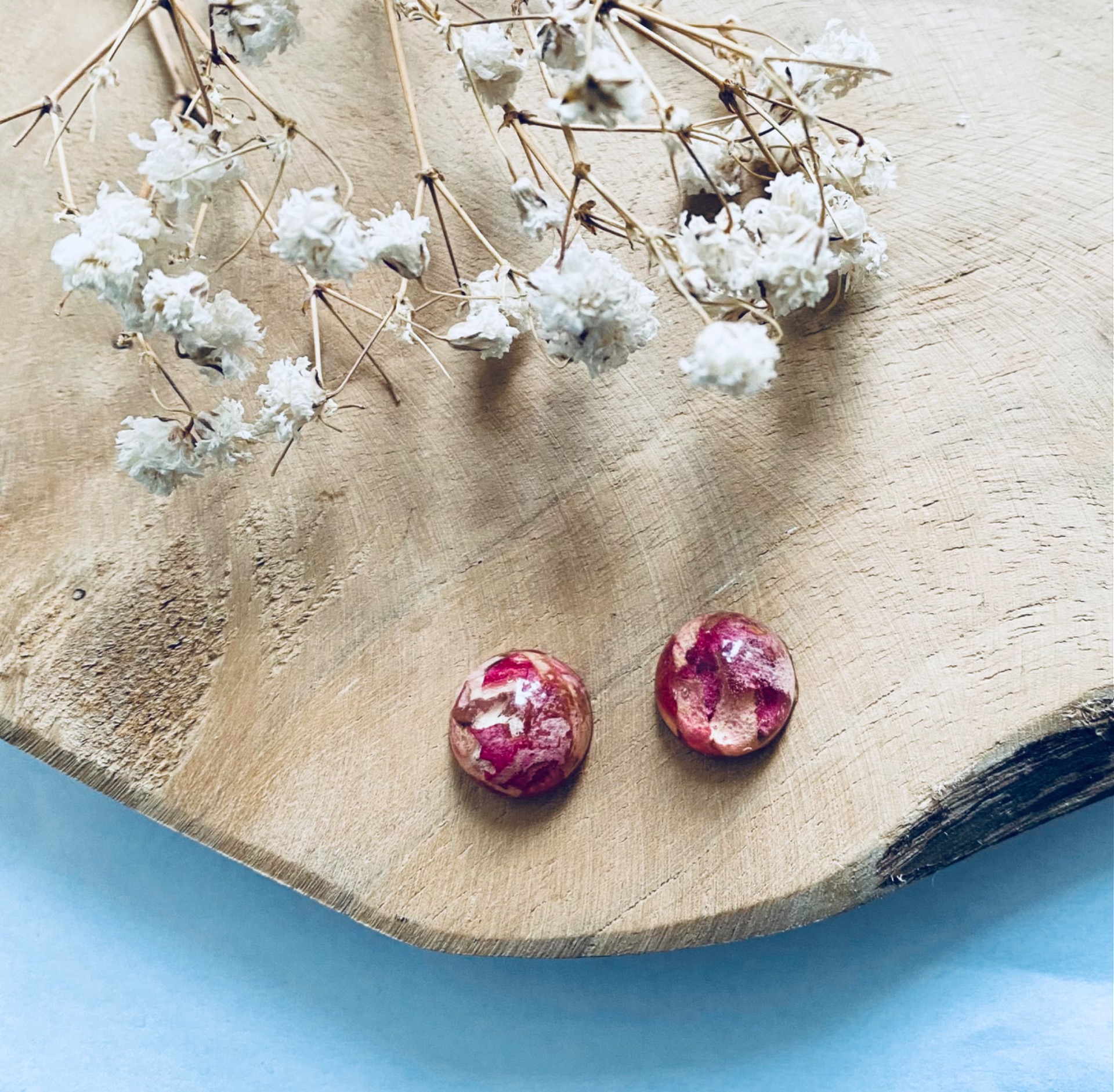 Malé půlkuličky s pravými sušenými květy Růže.Velikost: 1,3 cm.Puzety: Chirurgická ocel.