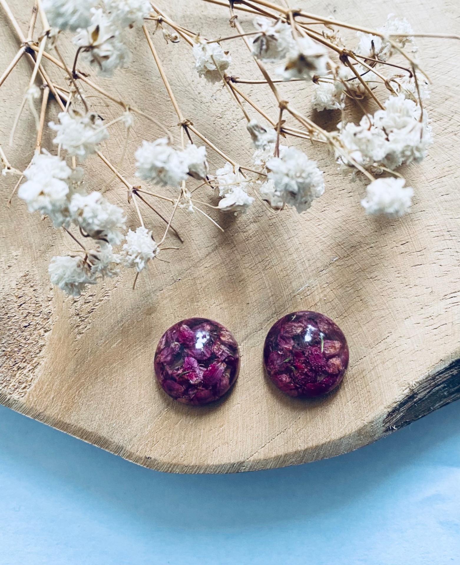 Malé půlkuličky s pravými sušenými květy Vřesu Erica.Velikost: 1,5 cm.Puzety: Chirurgická ocel.