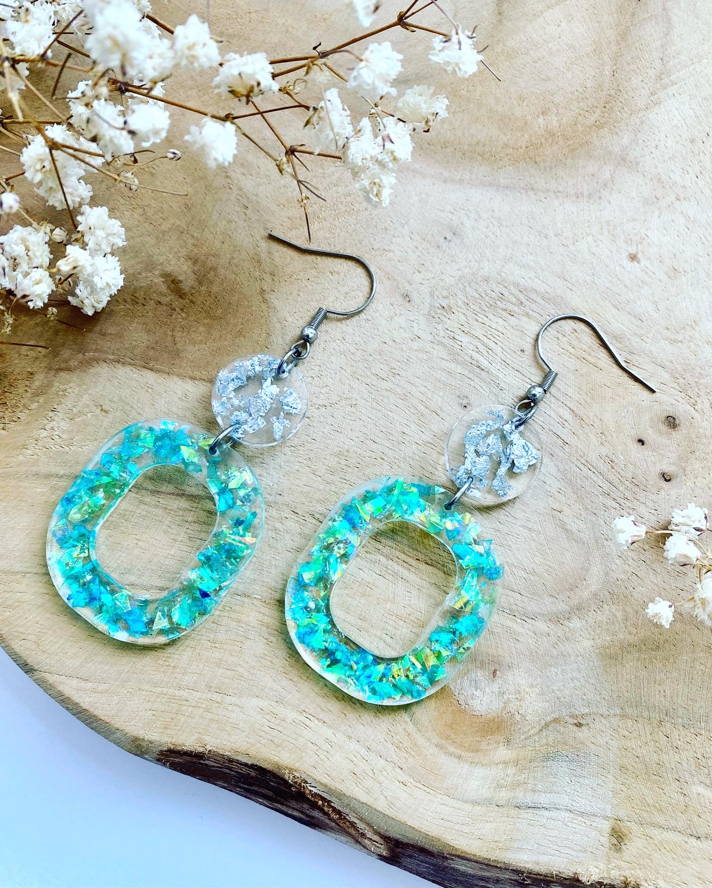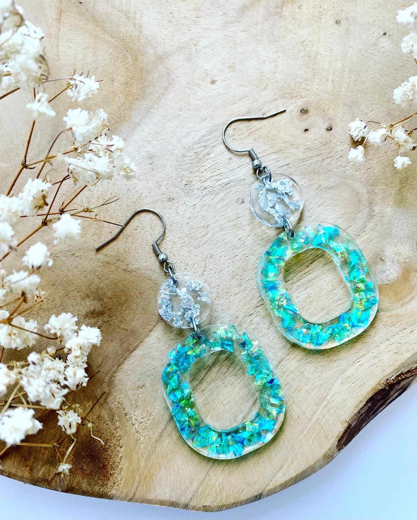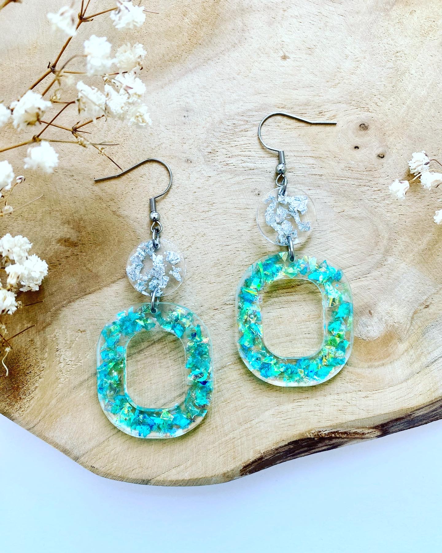 Náušnice visací se stříbrnými plátky a zeleno-modrými glitry.Velikost: 7 cm.Háčky: chirurgická ocel.