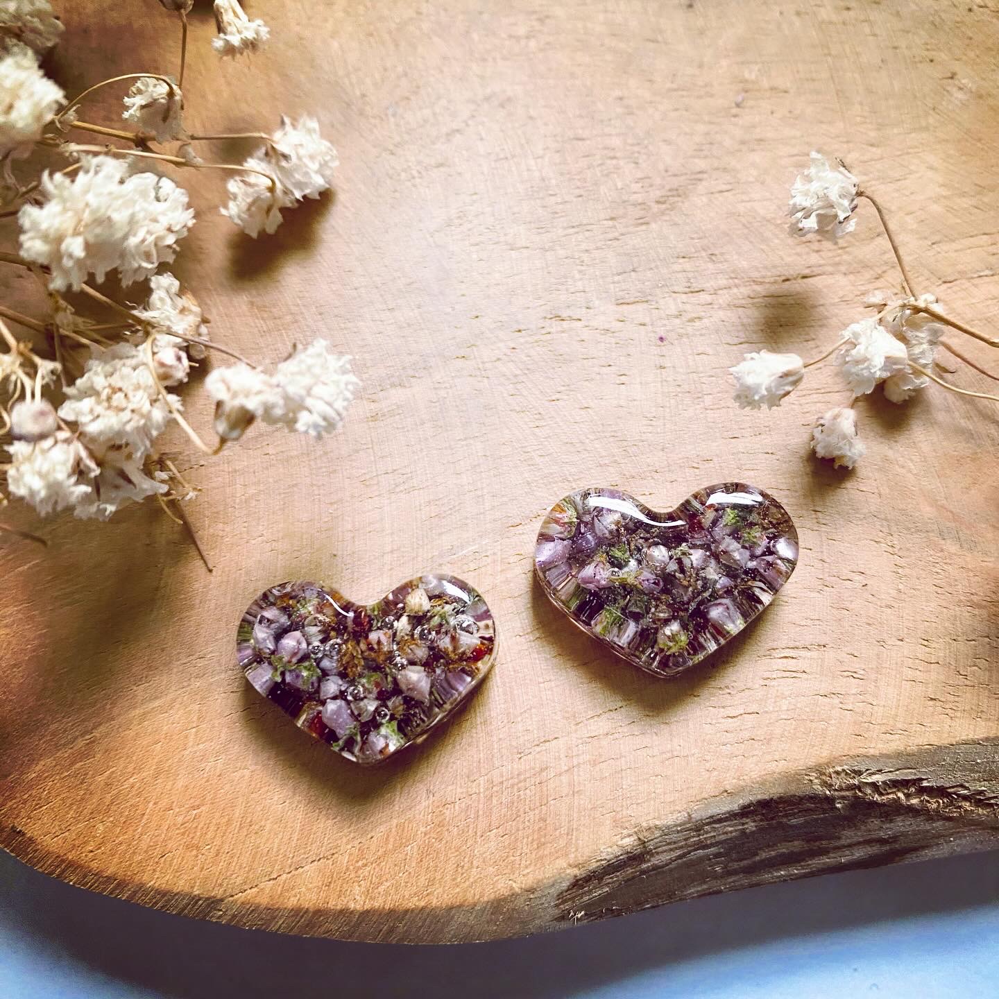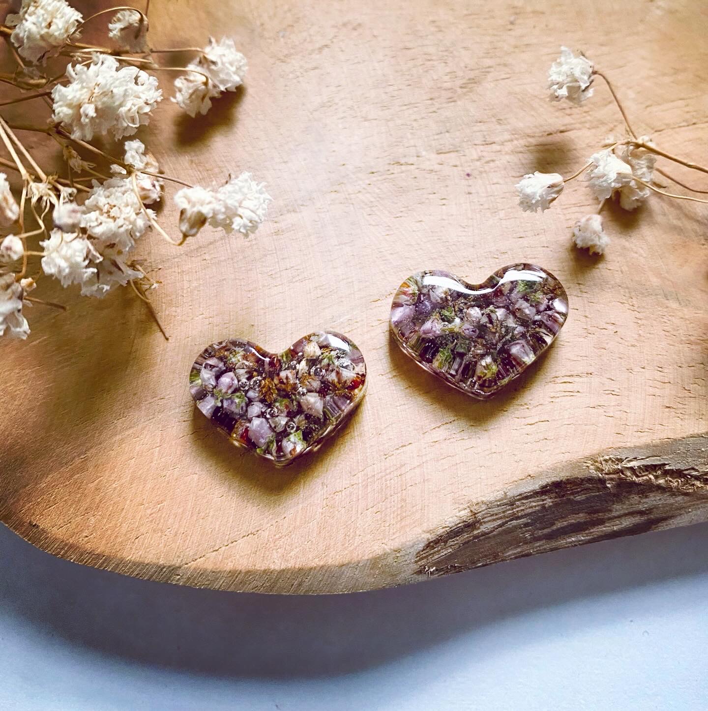 Náušnice srdíčka s pravými sušenými květy fialového Vřesu.