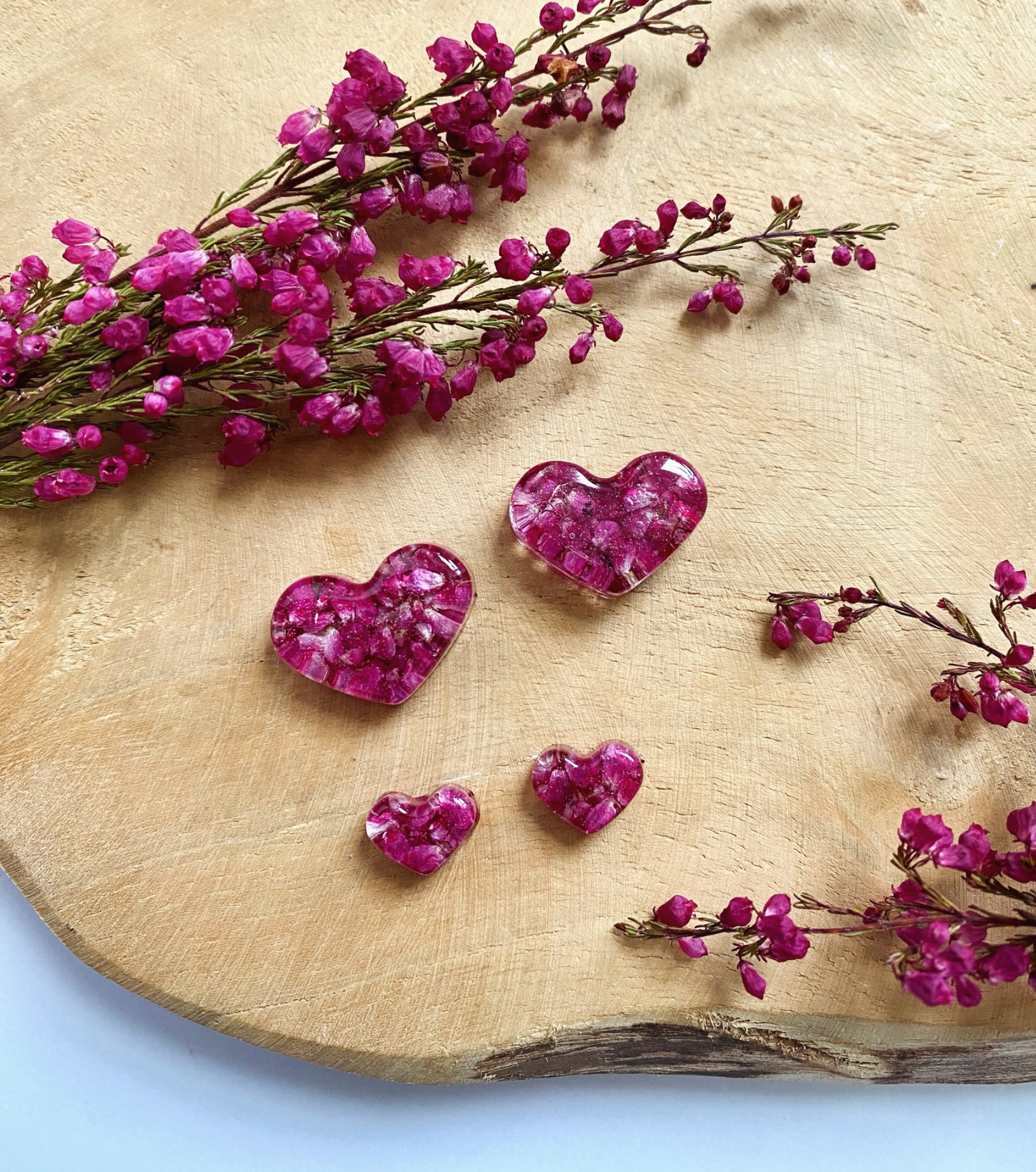 Náušnice srdíčka s pravými sušenými květy tmavého Vřesu Erica.Velikost: 1 cm.Puzety: chirurgická ocel.