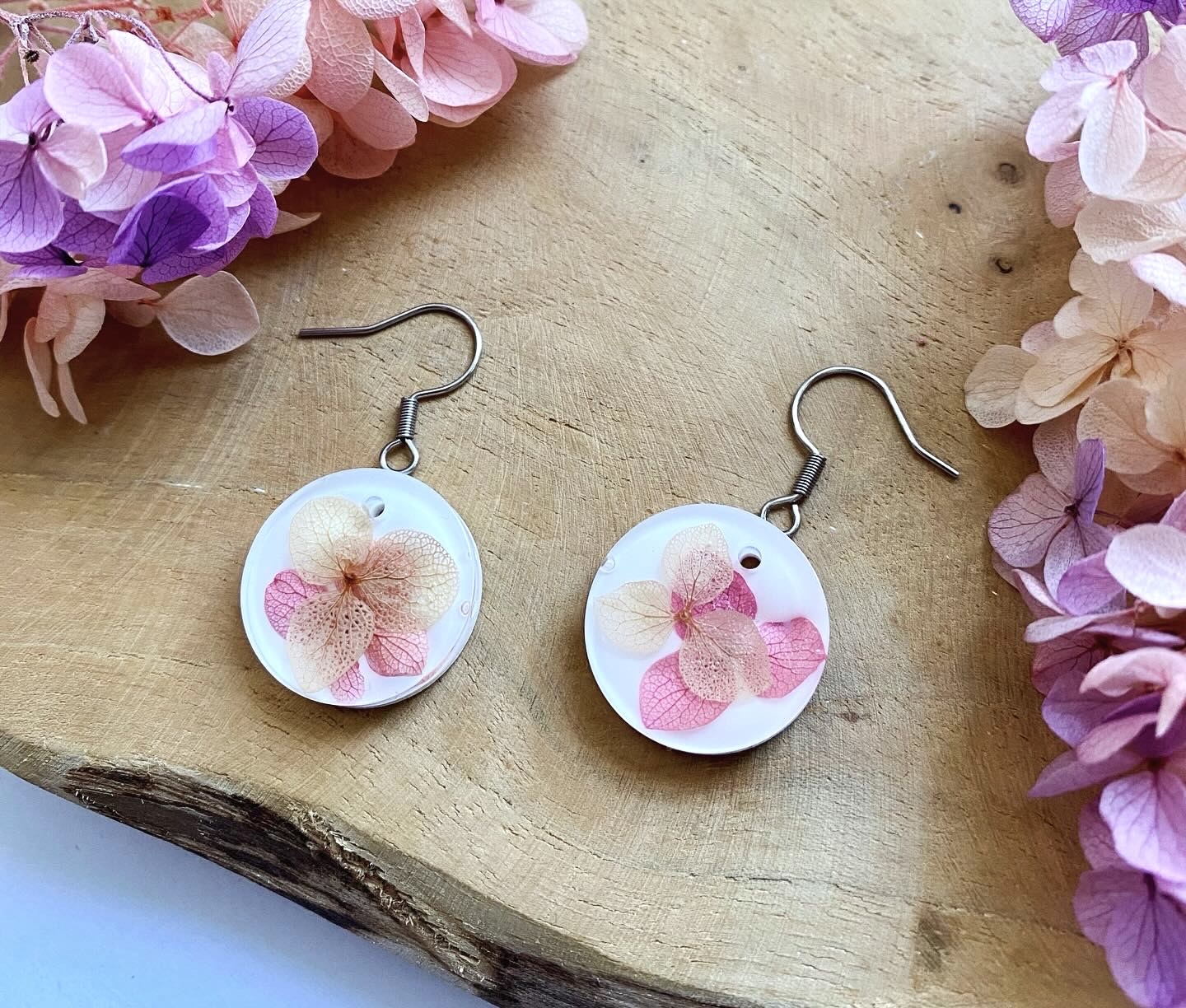 Náušnice s pravými sušenými květy Hortenzie.Velikost: 2 cm.Háčky: chirurgická ocel.