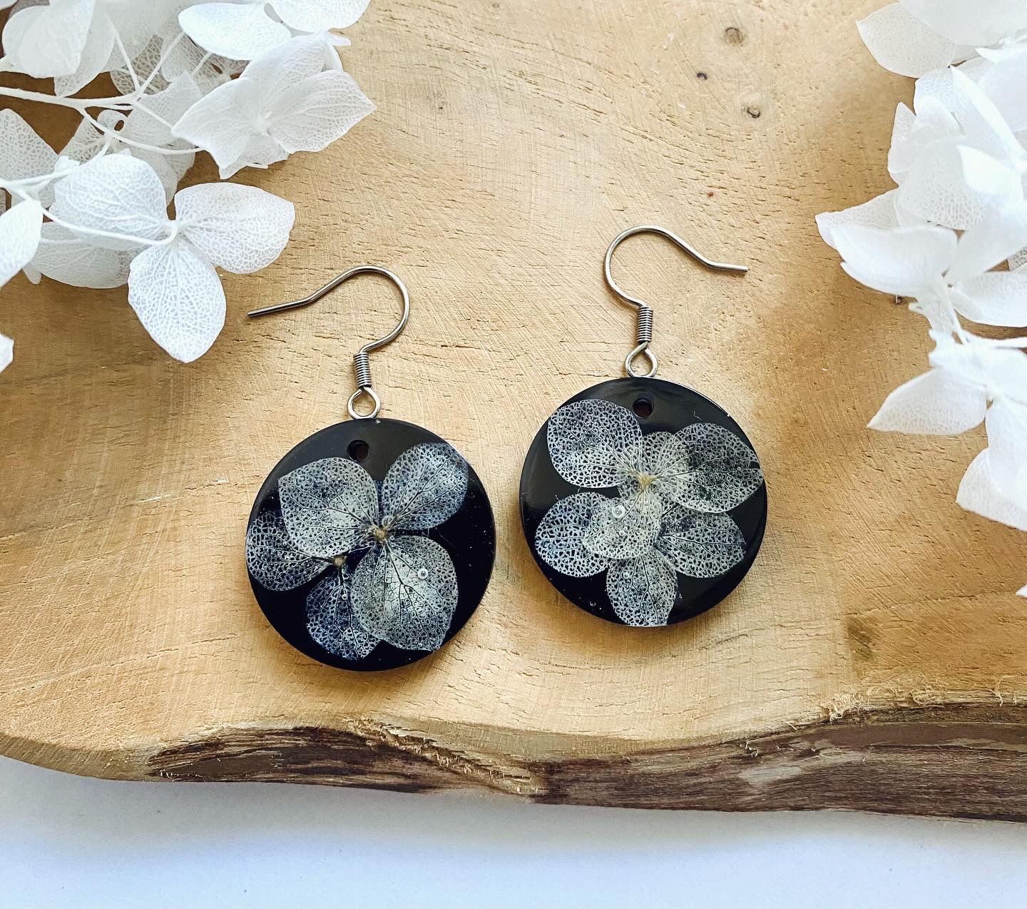 Náušnice s pravými sušenými květy Hortenzie.Velikost: 2,4 cm.Háčky: chirurgická ocel.