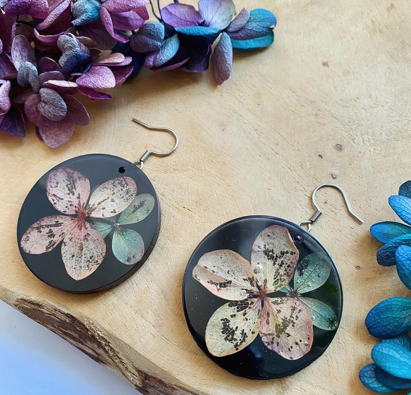 Náušnice s pravými sušenými květy Hortenzie.Velikost: 3,9 cm.Háčky: chirurgická ocel.