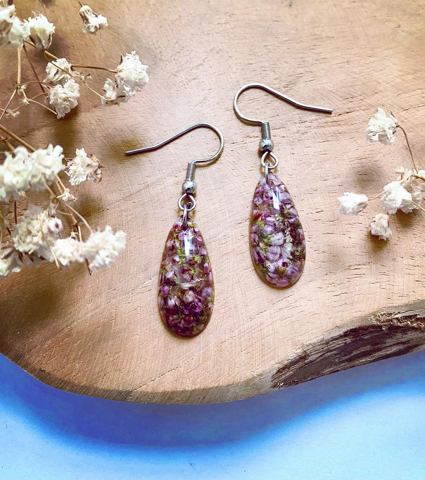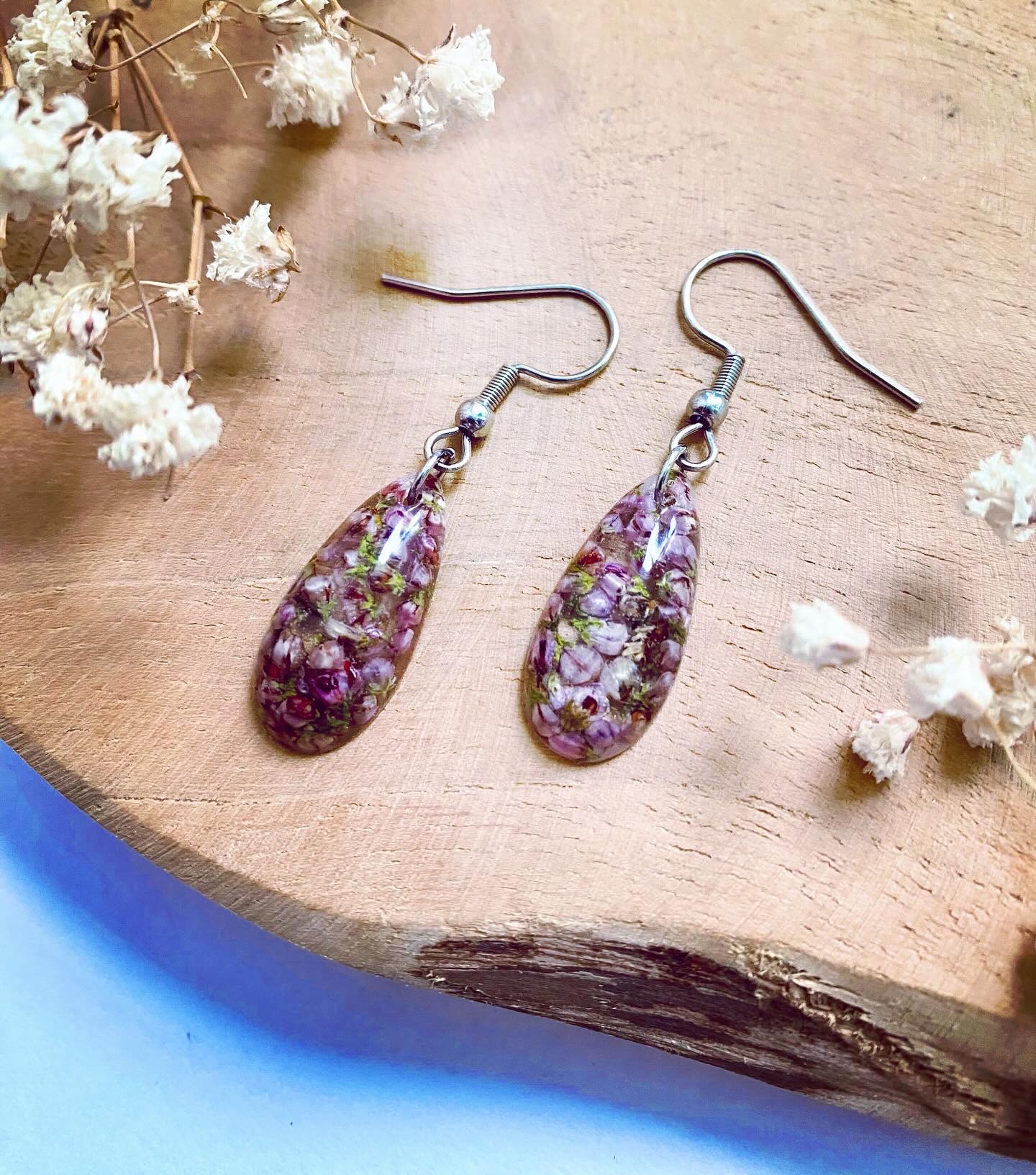 Náušnice visací krystaly s pravými sušenými květy fialového Vřesu.Velikost: 2,3 cm.Háčky: Chirurgická ocel.