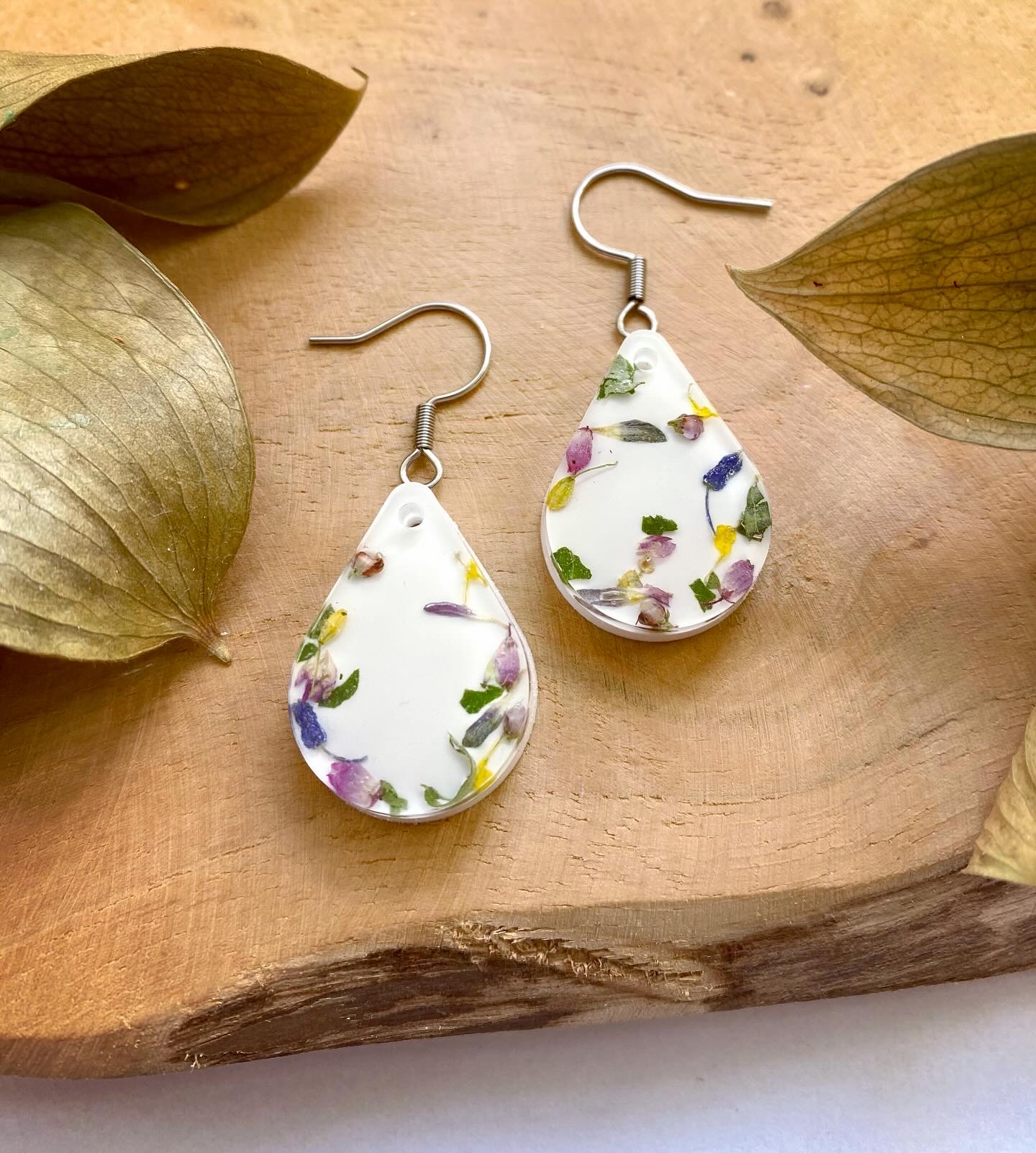 Náušnice visací kapky s pravými sušenými květy Lučního kvítí.
