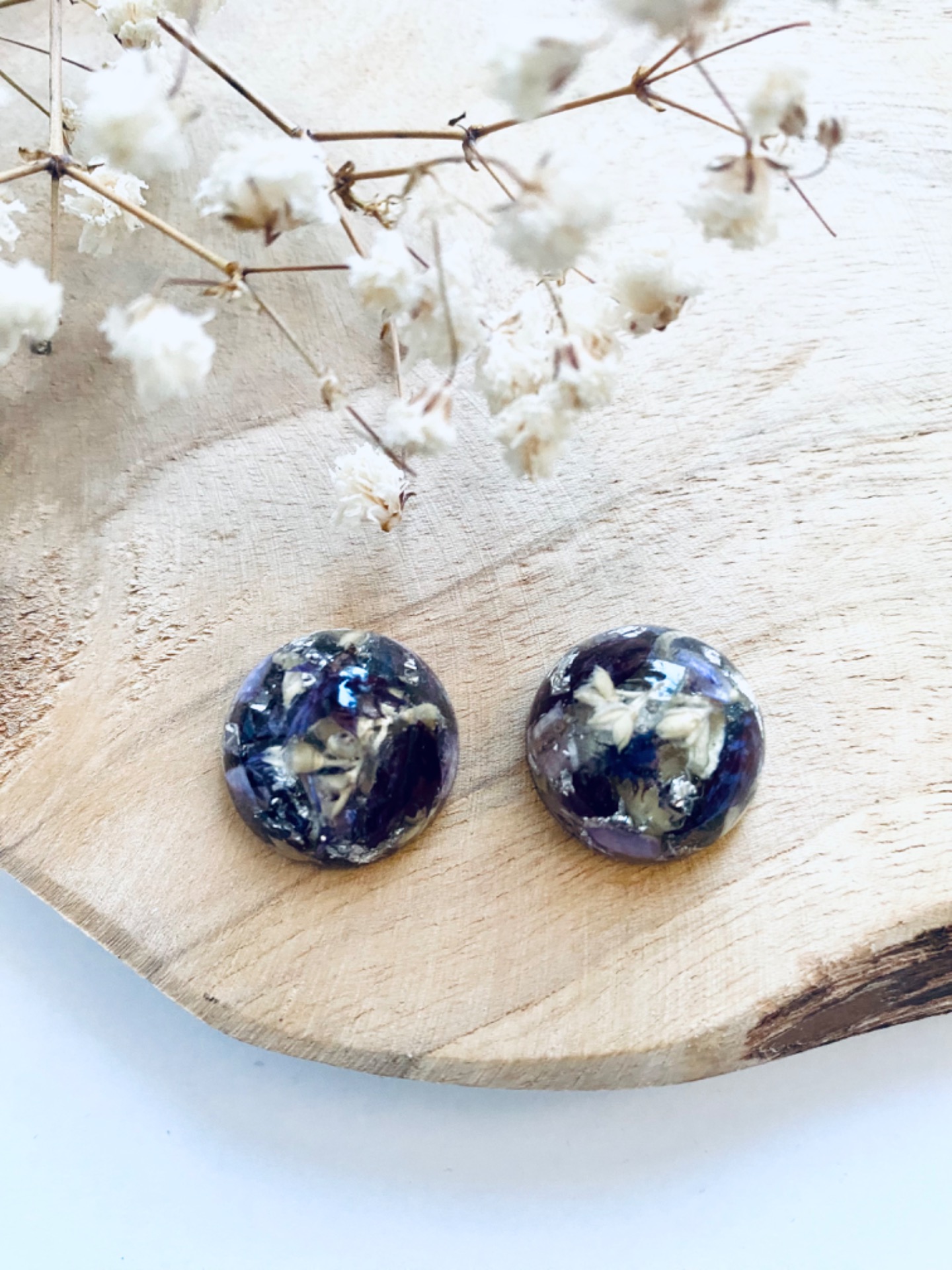 Střední půlkuličky s pravými sušenými květy a stříbrnými plátky.