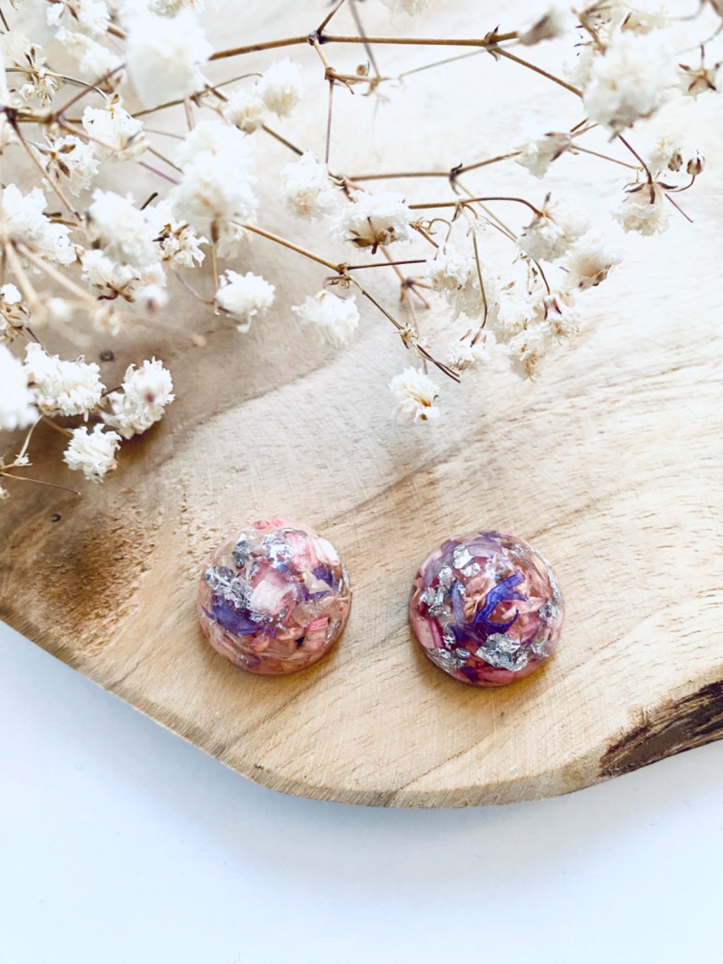 Střední půlkuličky s pravými sušenými květy a stříbrnými plátky.Velikost: 1,8 cm.Puzety: Chirurgická ocel.