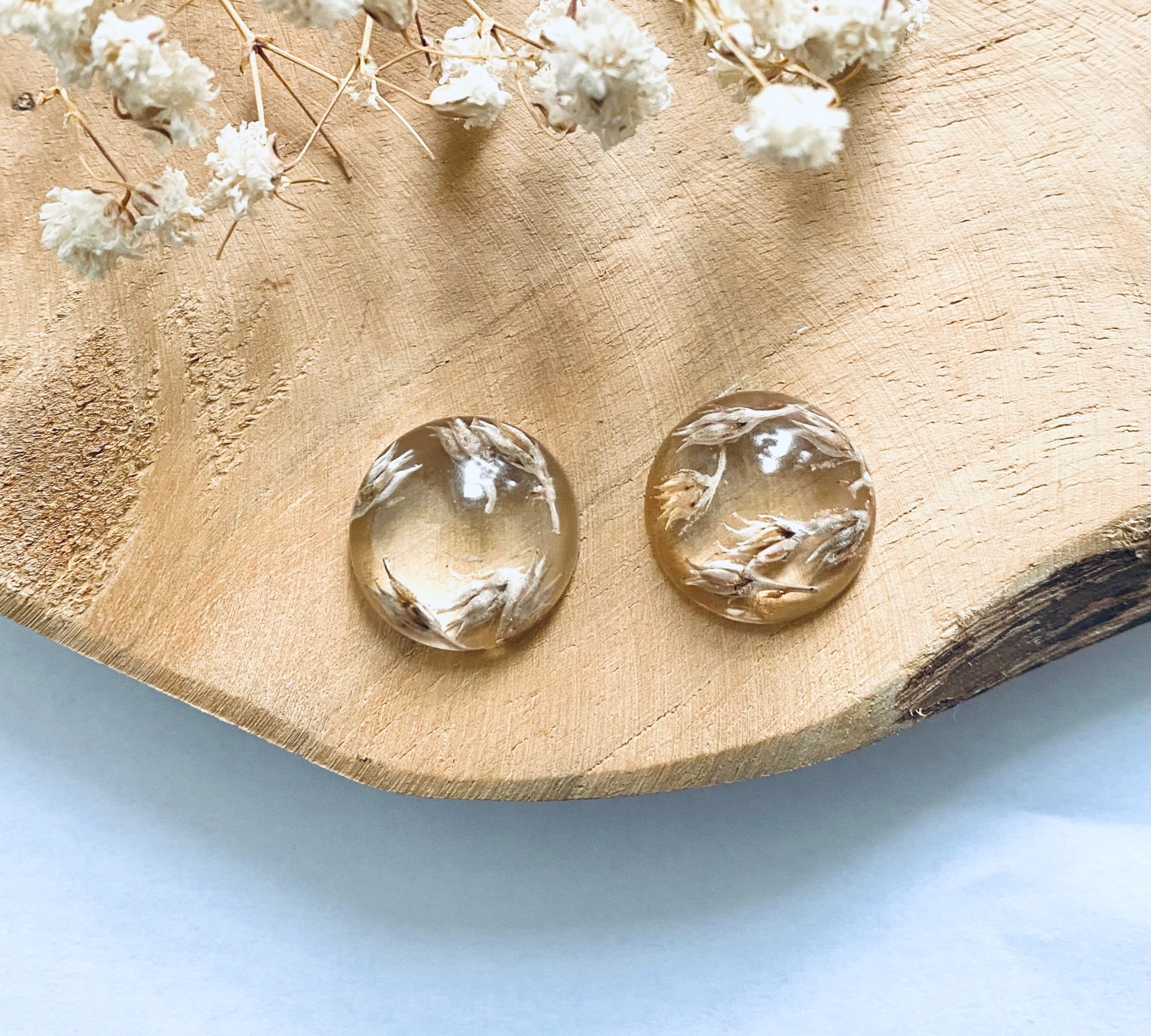 Střední půlkuličky s pravými sušenými květy.Velikost: 1,8 cm.Puzety: Chirurgická ocel.
