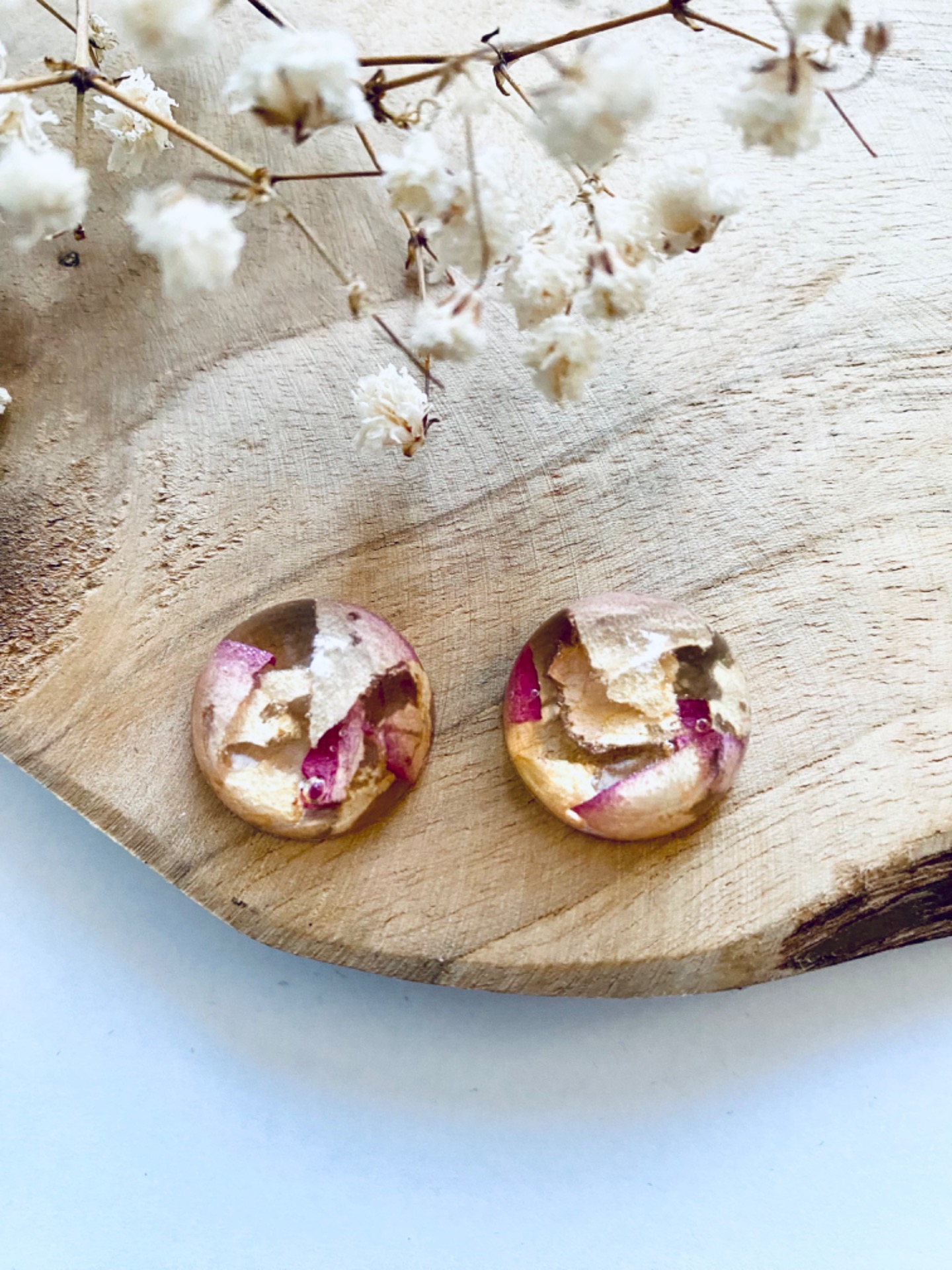 Střední půlkuličky s pravými sušenými květy Růže.Velikost: 1,8 cm.Puzety: Chirurgická ocel.