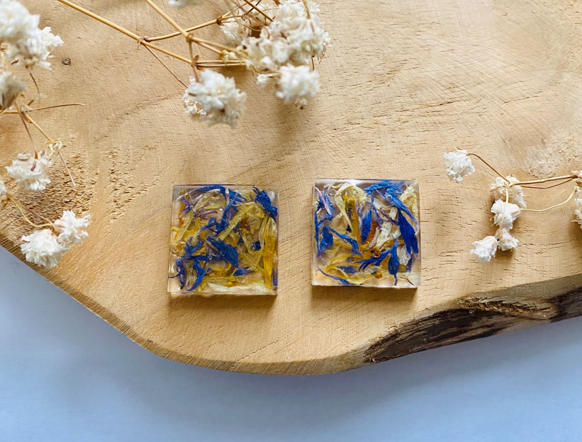 Náušnice velké čtverce s pravými sušenými květy Chrpy a Měsíčku.Velikost: 2 cm.Puzety: Chirurgická ocel.