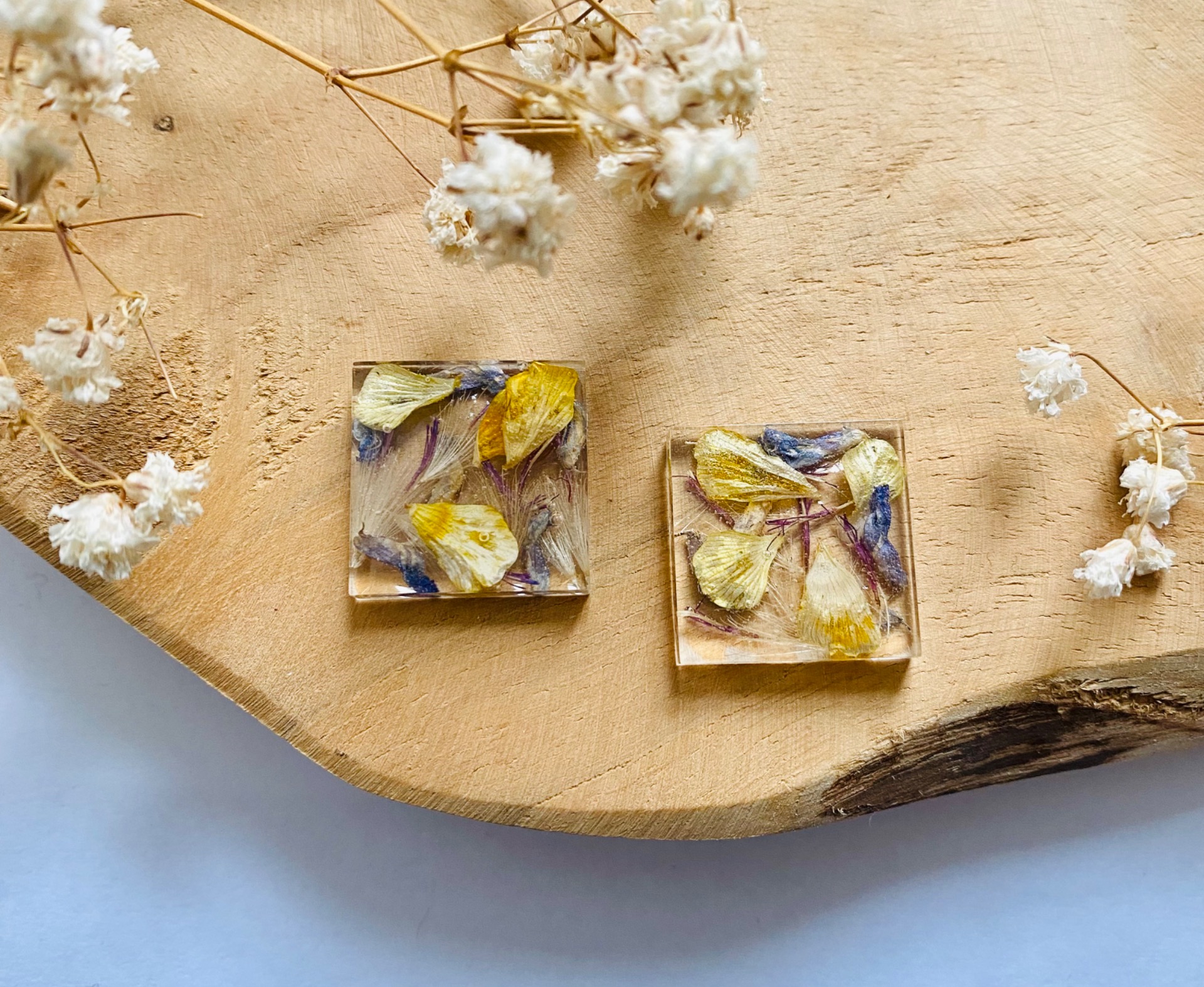 Náušnice velké čtverce s pravými sušenými květy.Velikost: 2 cm.Puzety: Chirurgická ocel.