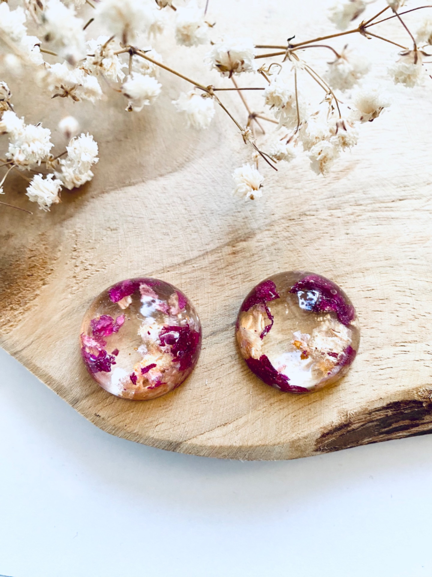 Velké půlkuličky s pravými sušenými květy Růže.Velikost: 2,2 cm.Puzety: Chirurgická ocel.