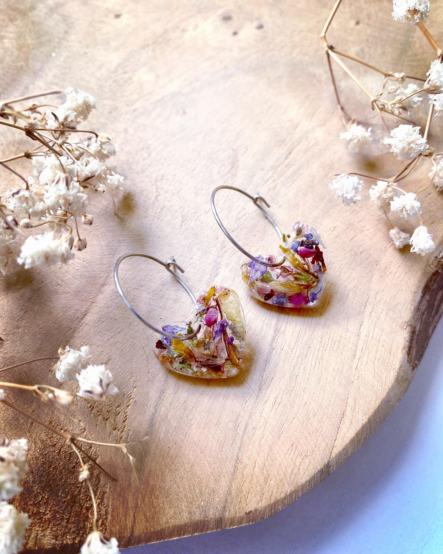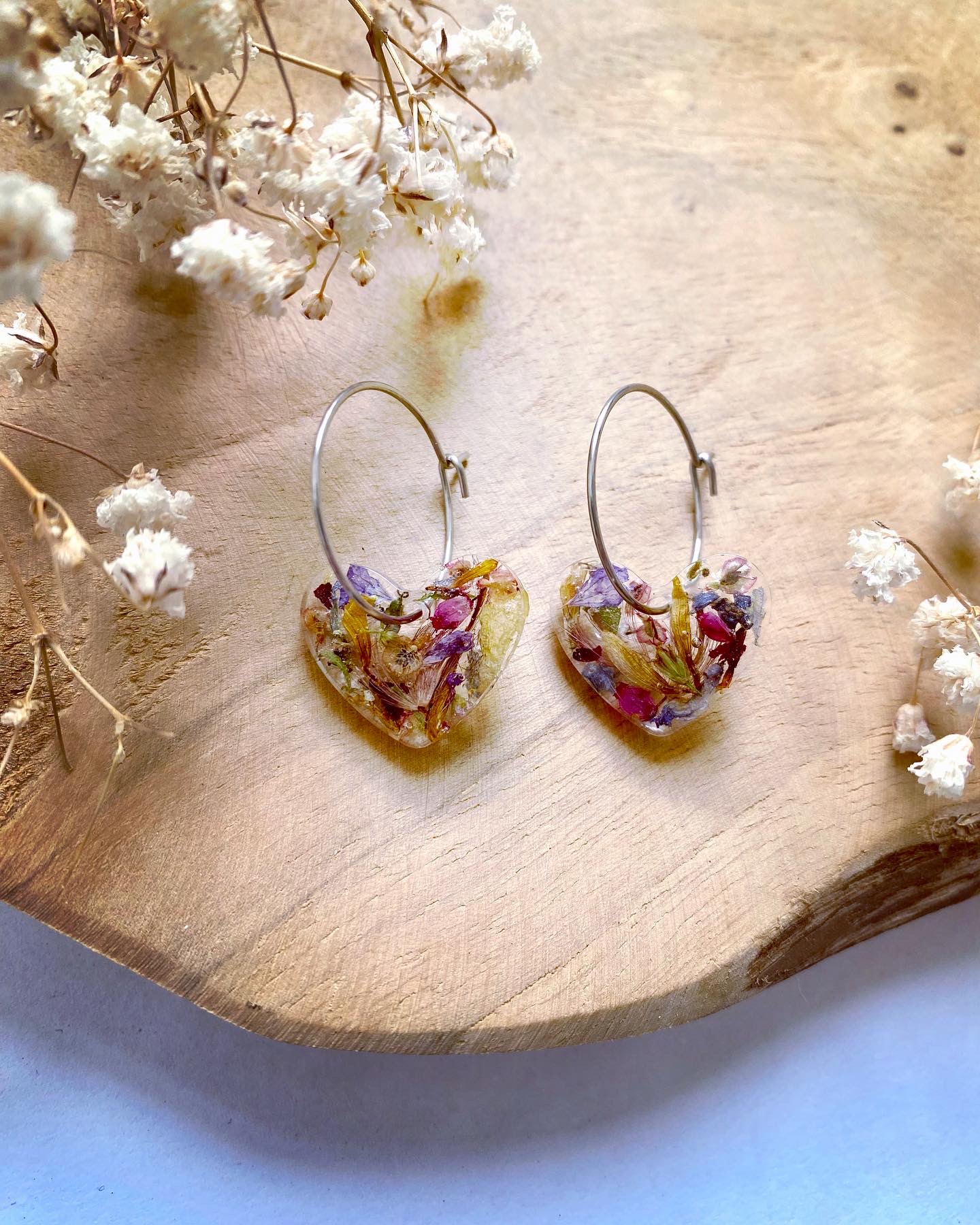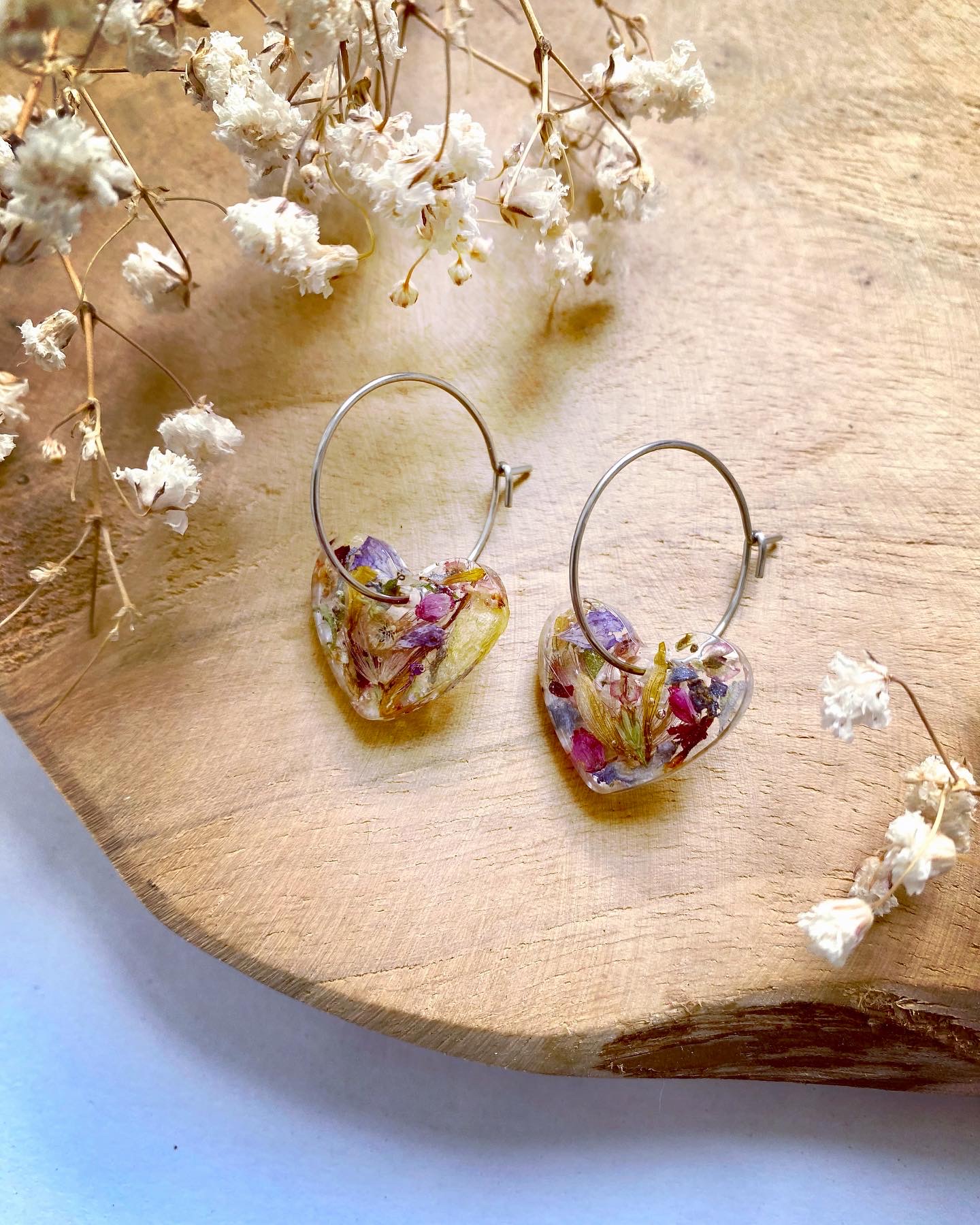 Náušnice visací s pravými sušenými květy Lučního kvítí.Velikost srdíček: 1,9 cmVelikost kruhu: 2 cm.Kruhy: chirurgická ocel.