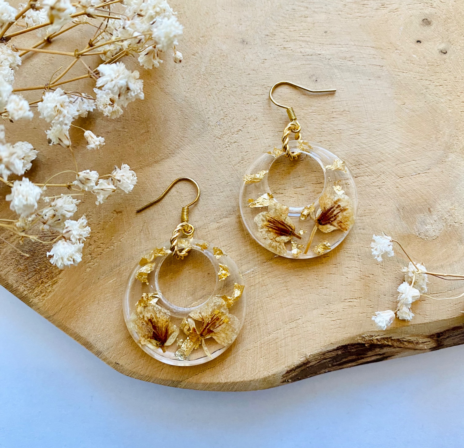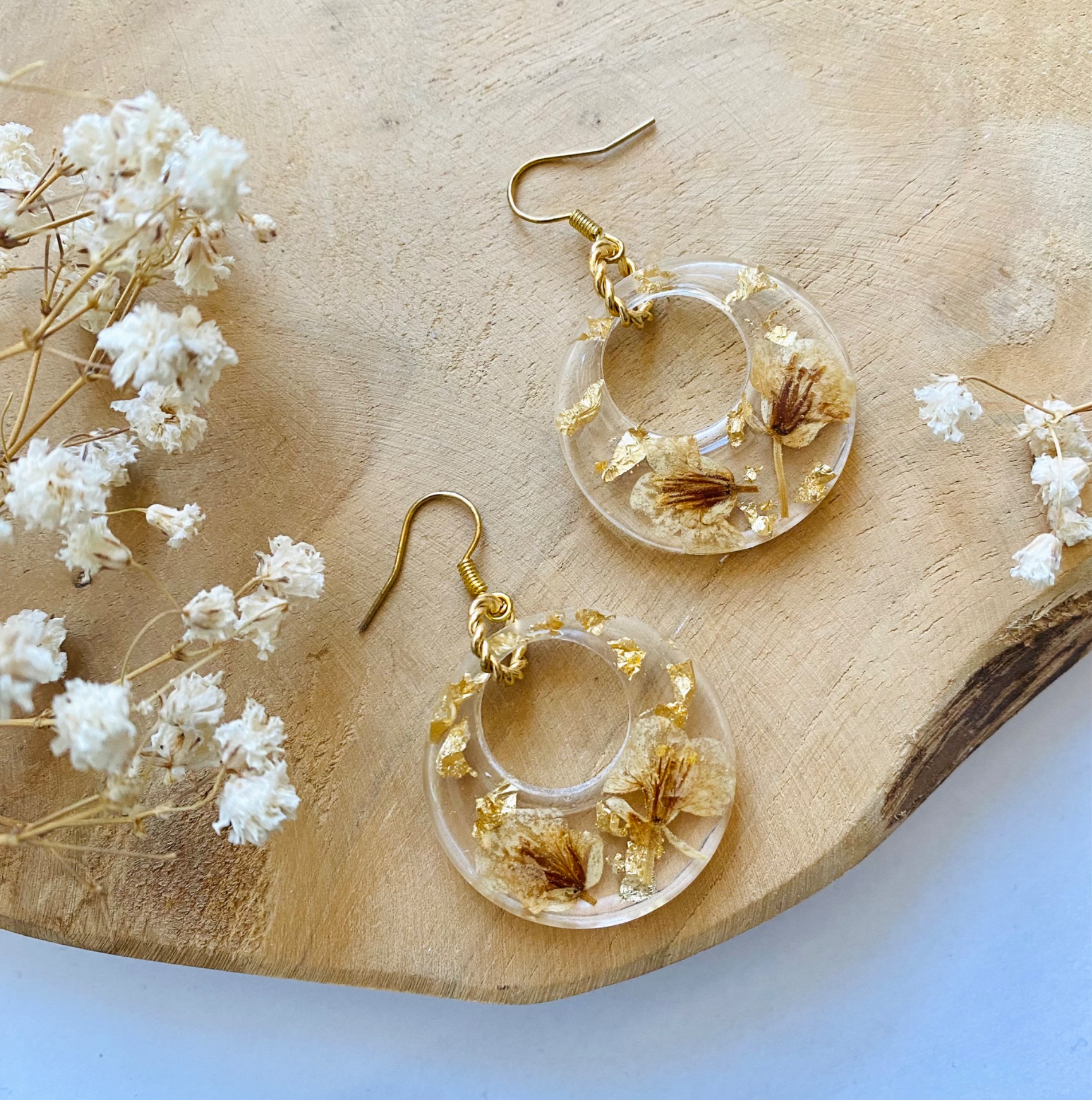 Náušnice visací s pravými sušenými květy a zlatými plátky.Velikost: 2,9 cm.Háčky: Nerezová ocel - barva zlatá.