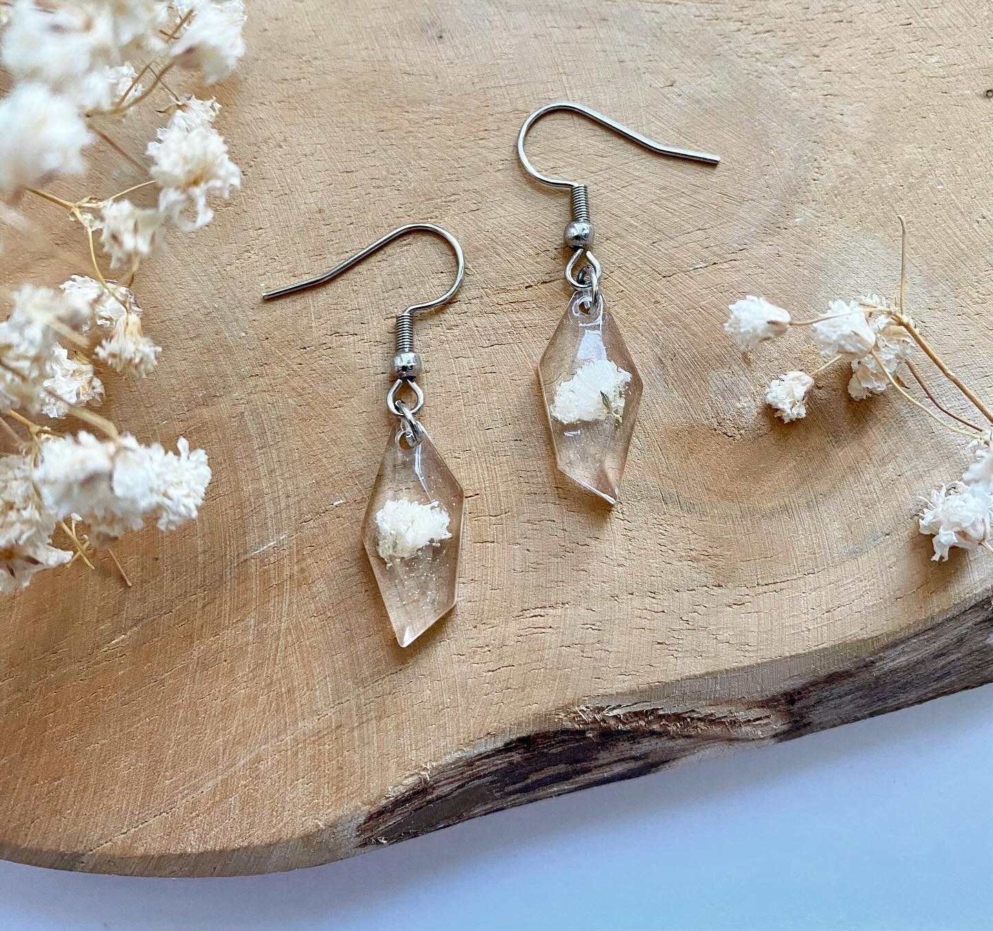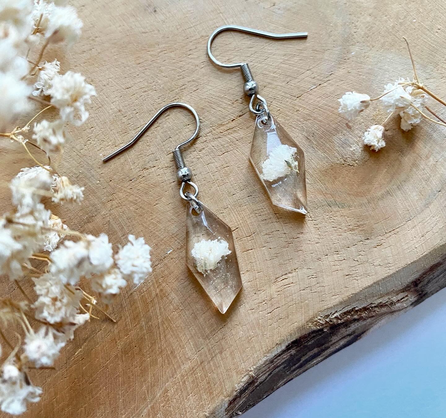 Náušnice visací krystaly s pravými sušenými květy Gypsophila.Velikost: 2,2 cm.Háčky: Chirurgická ocel.