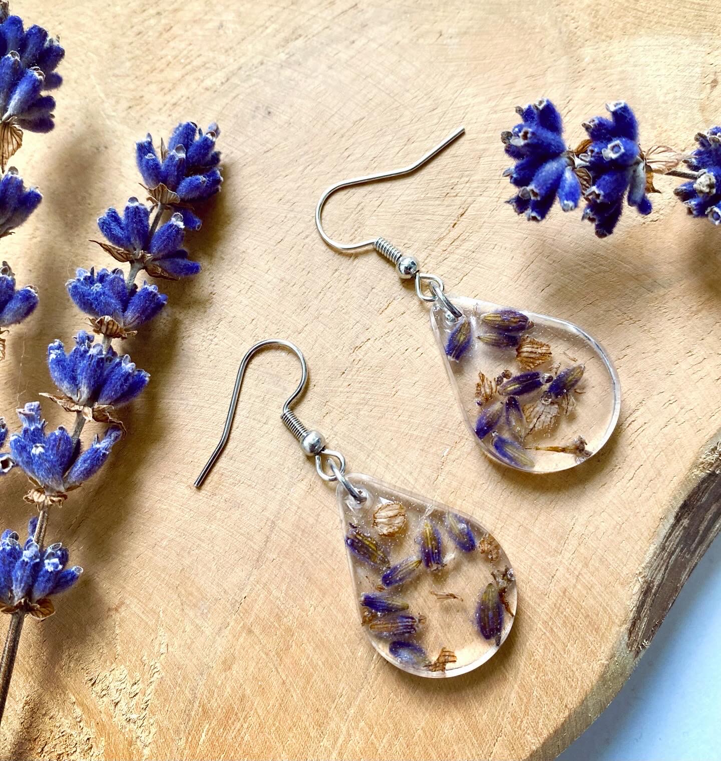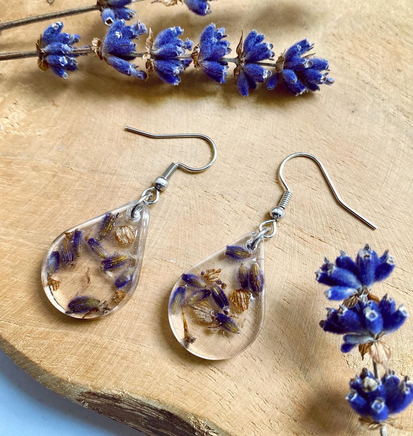 Náušnice visací kapky s pravými sušenými květy Levandule. Velikost: 2,4 cm.Háčky: Chirurgická ocel.