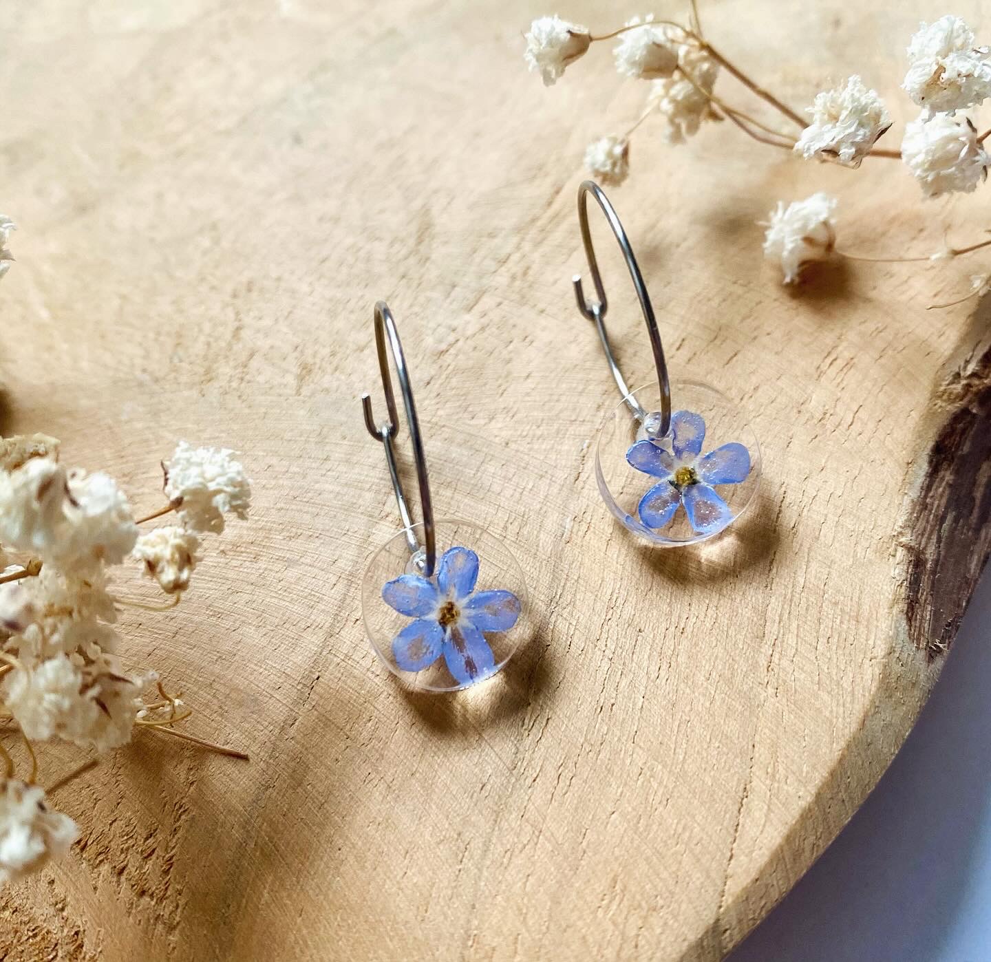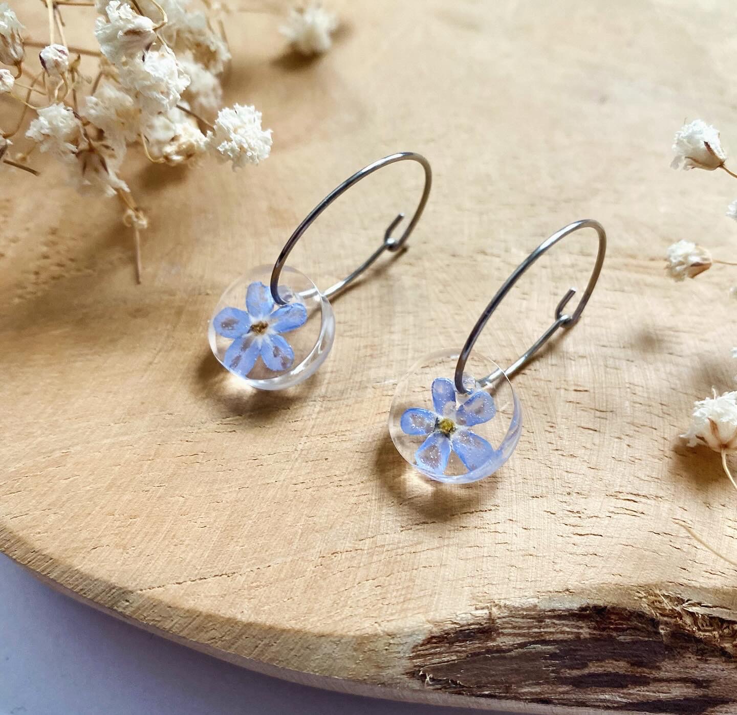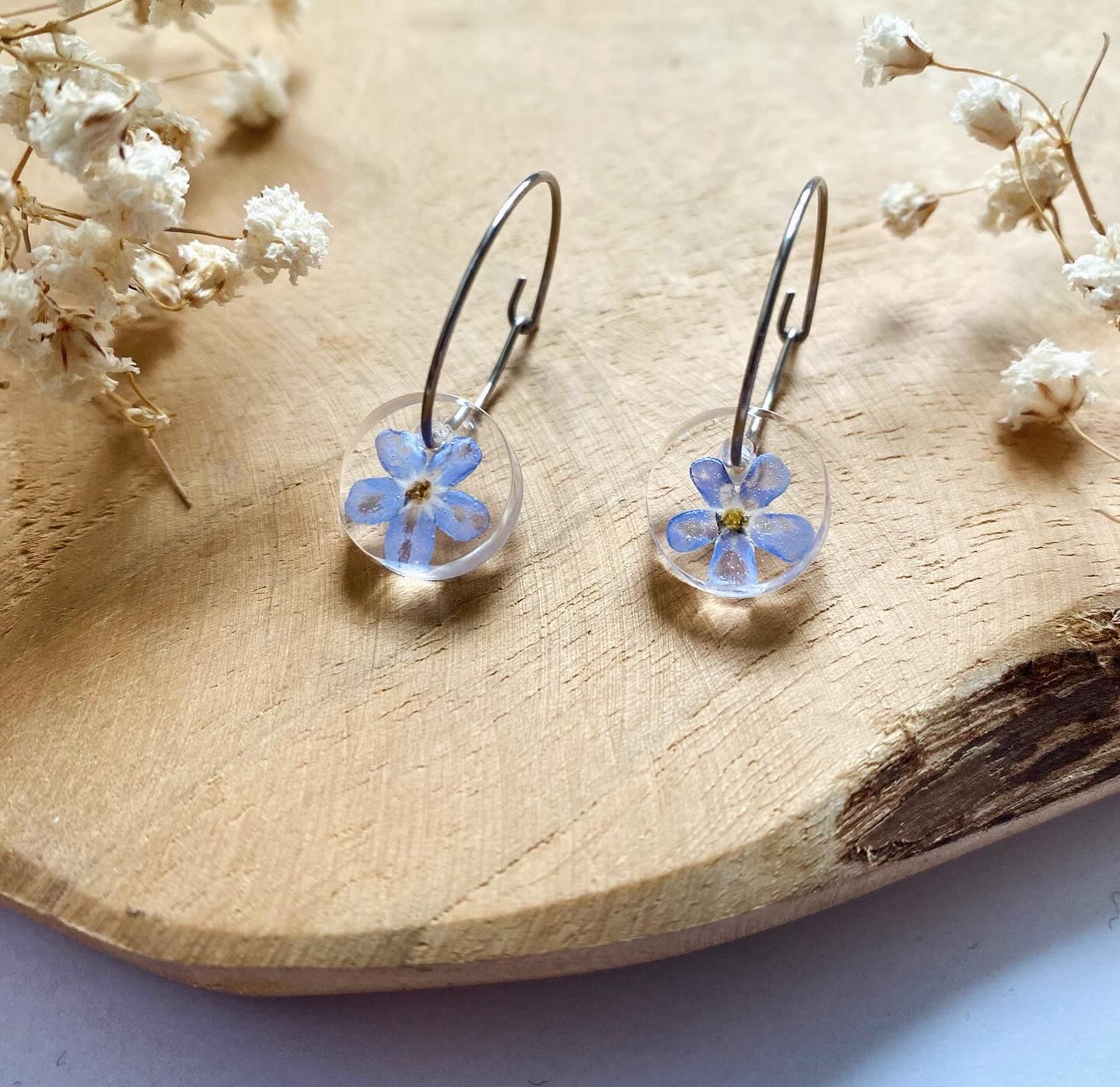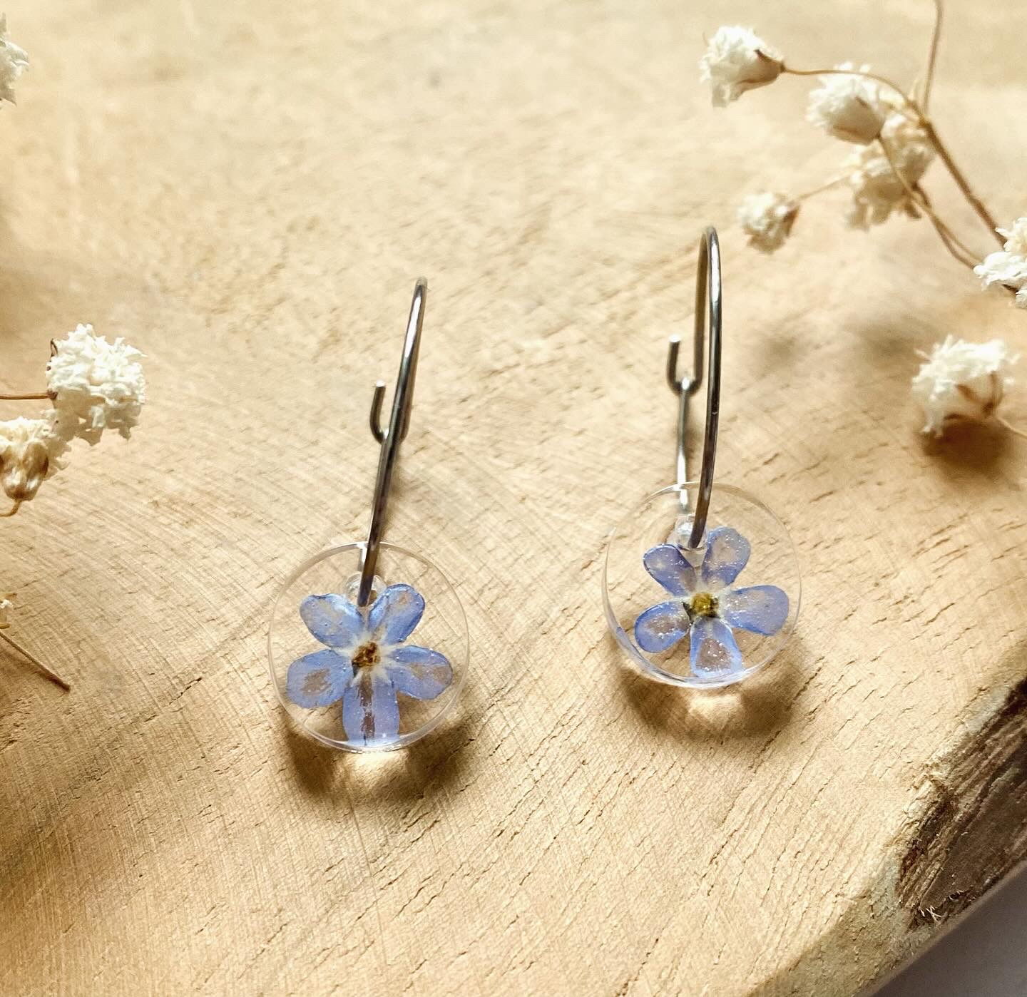 Náušnice visací s pravými sušenými květy Pomněnky.Velikost: 1,1 cm.Háčky: chirurgická ocel / 2 cm.