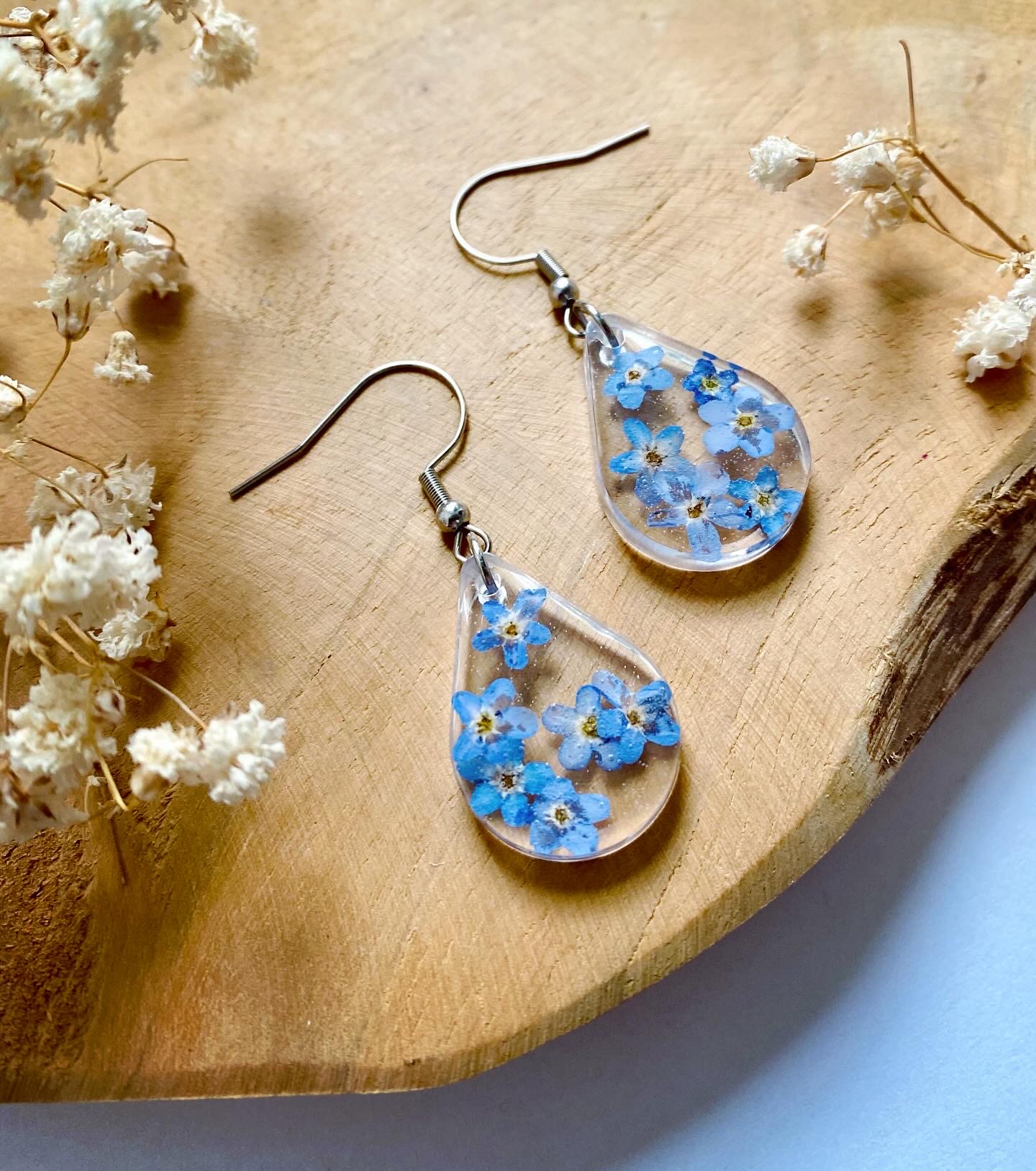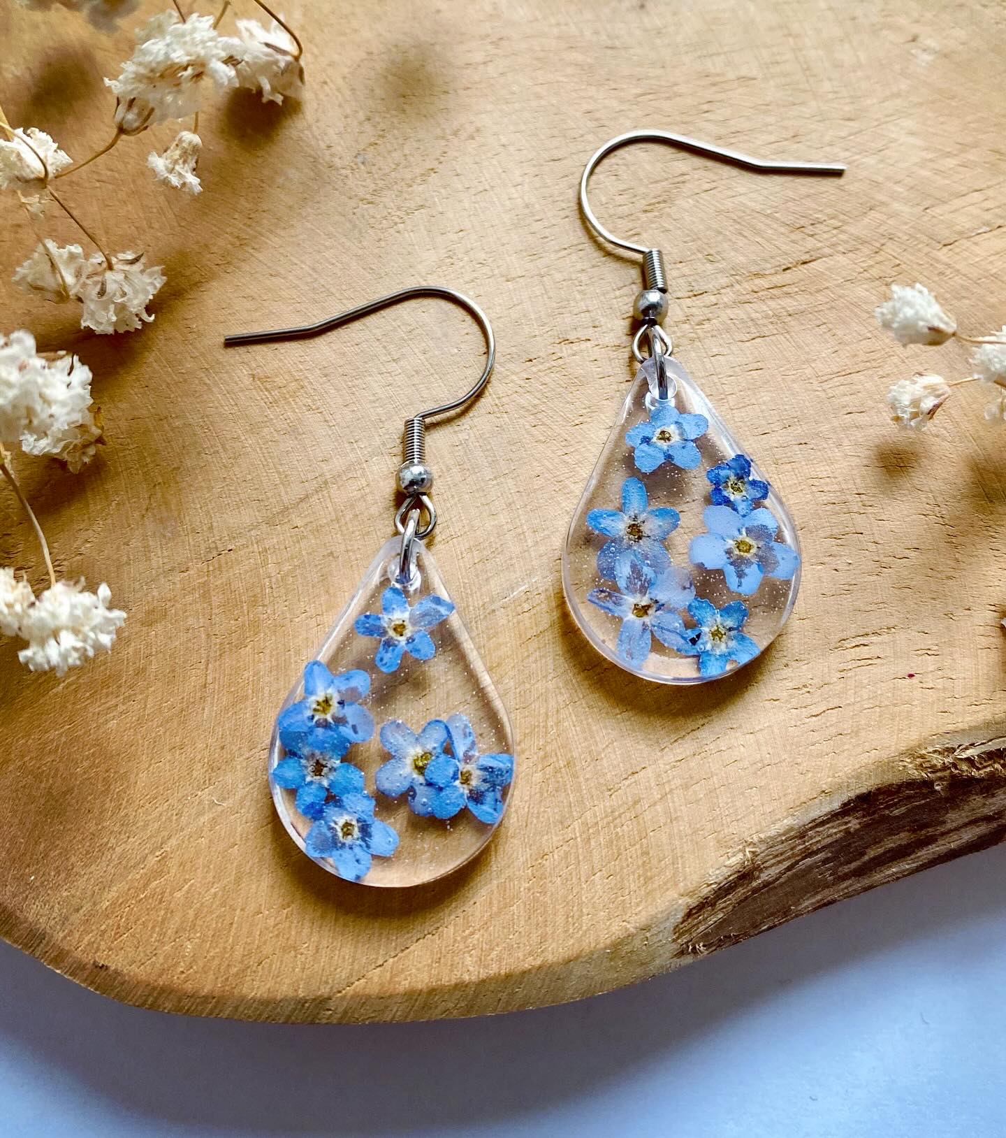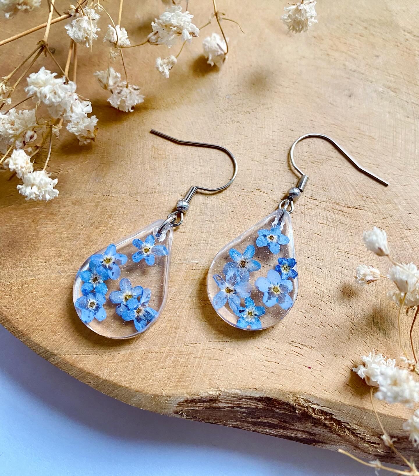 Náušnice visací kapky s pravými sušenými květy Pomněnek. Velikost: 2,4 cm.Háčky: Chirurgická ocel.