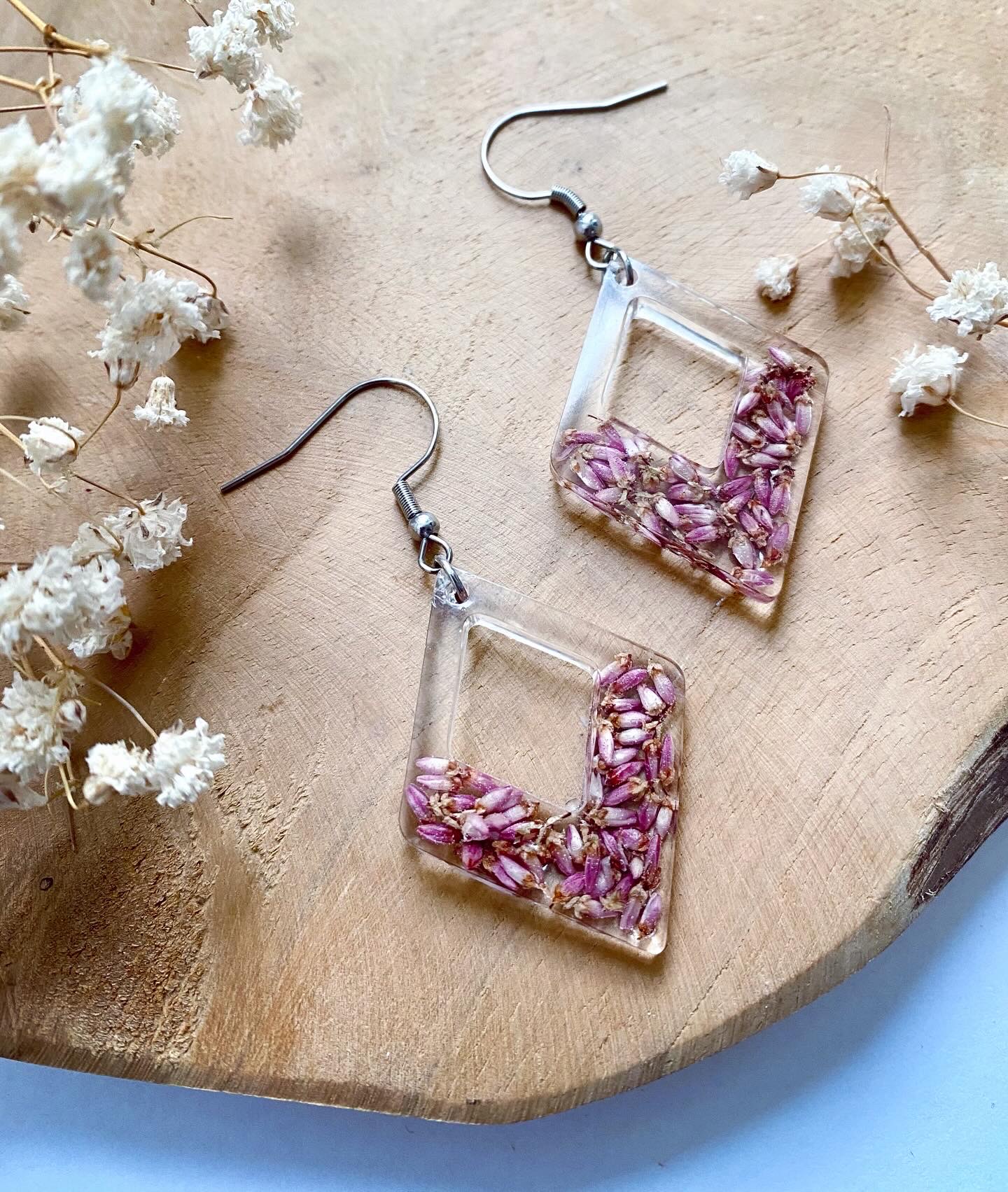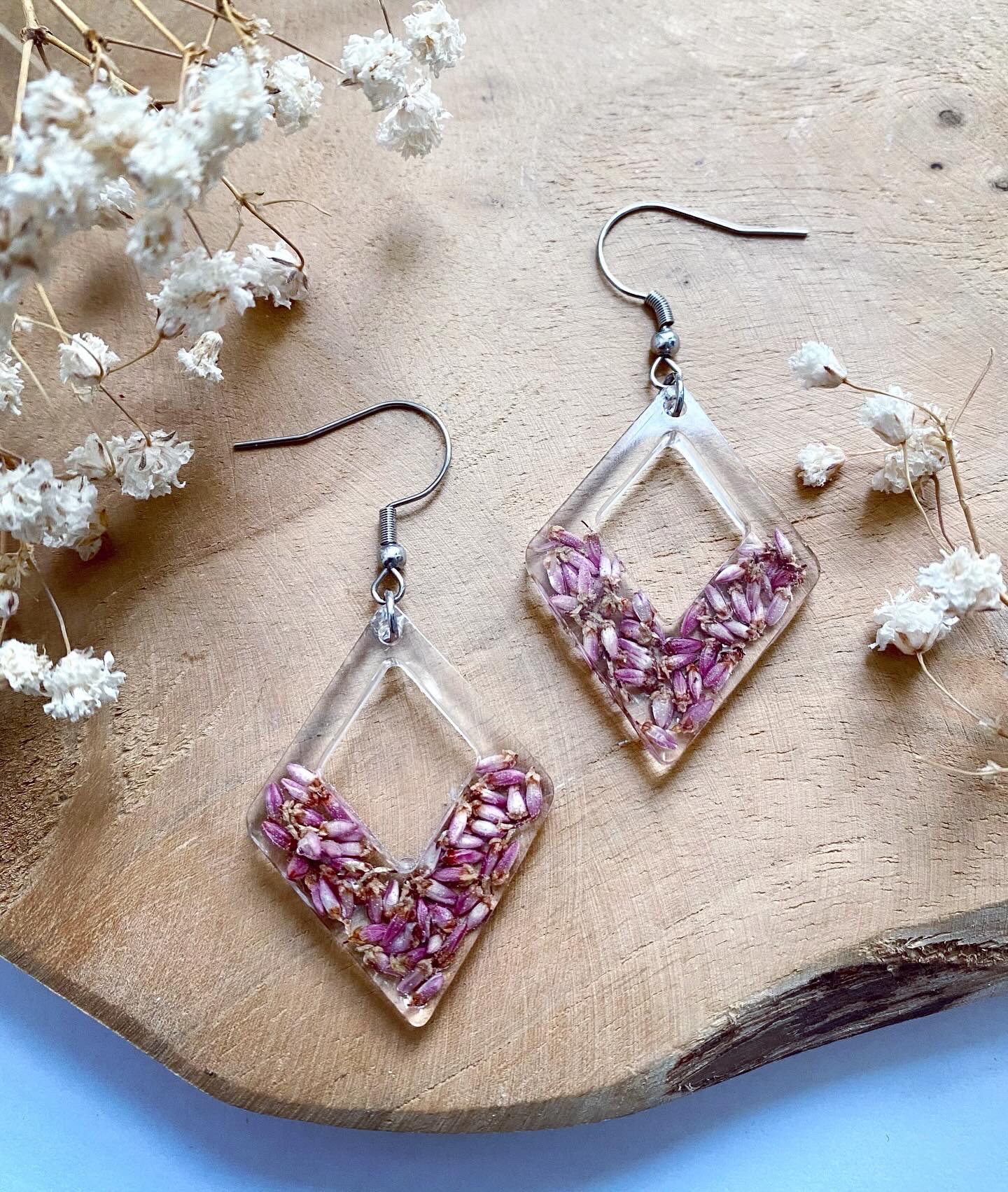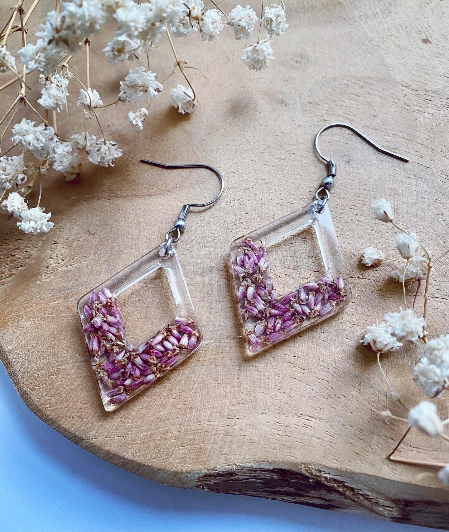 Náušnice visací s pravými sušenými květy Vřesu.Velikost: 4 cm.Háčky: Chirurgická ocel.