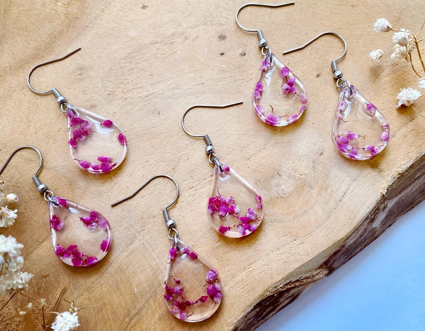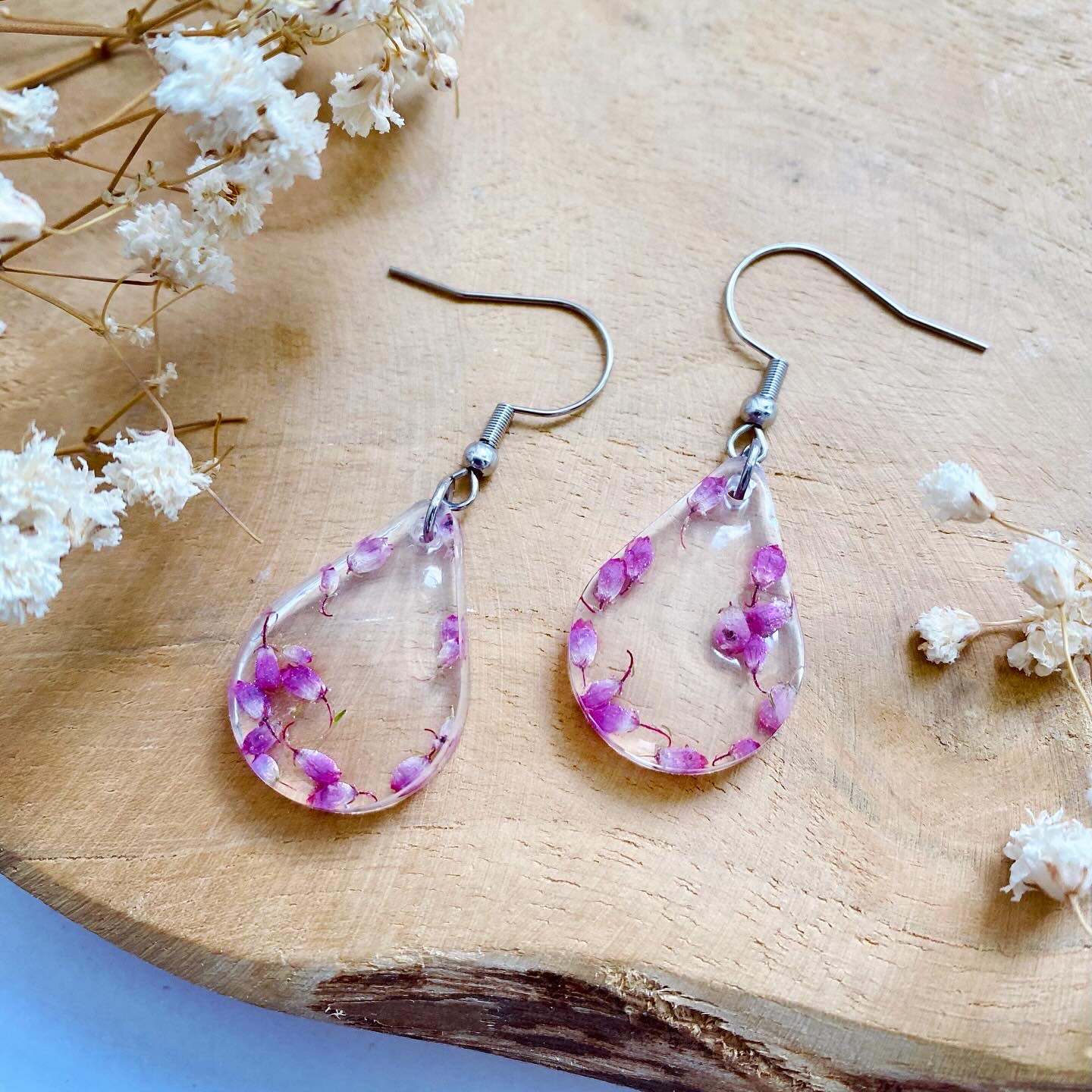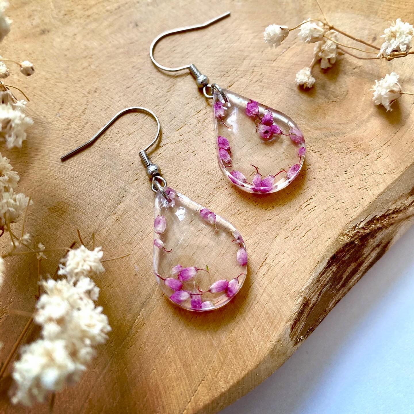 Náušnice visací kapky s pravými sušenými květy světle růžového Vřesu Erica.Velikost: 2,4 cm.Háčky: Chirurgická ocel.