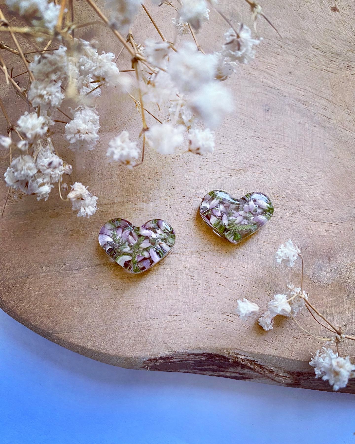 Náušnice srdíčka s pravými sušenými květy fialového Vřesu.Velikost: 1,8 cm.Puzety: chirurgická ocel.