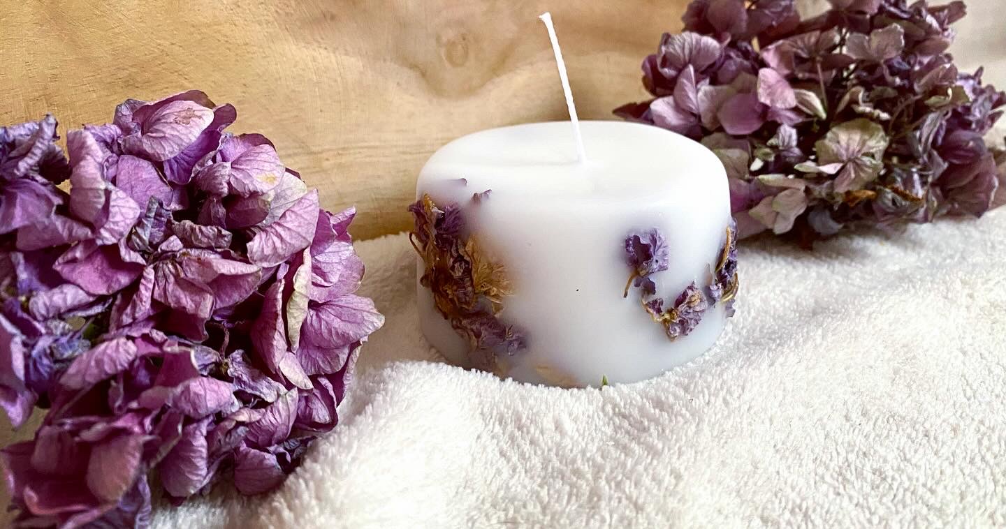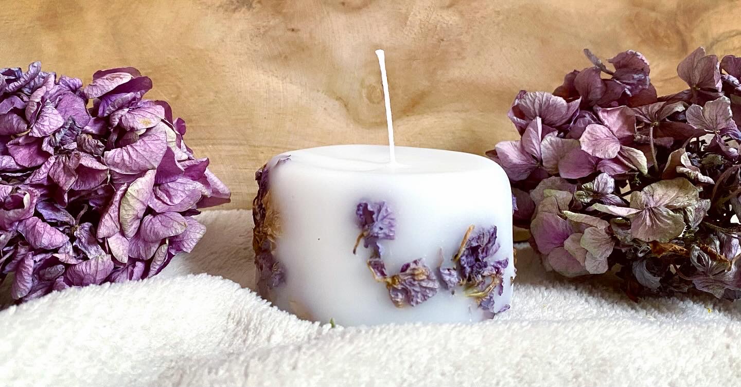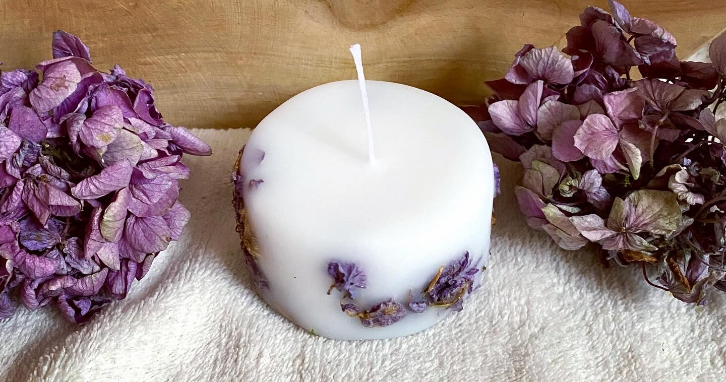 Ručně vyrobená svíčka z Parafínového vosku obohacená o pravé sušené květy Hortenzie.