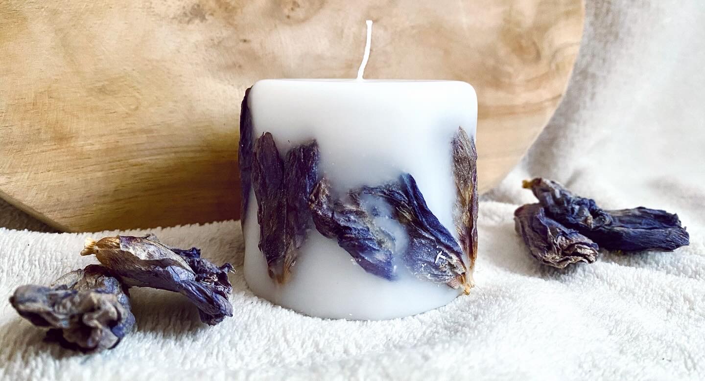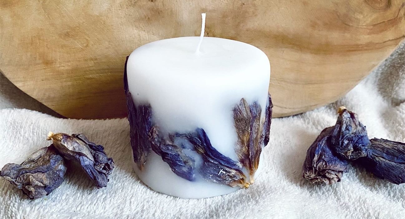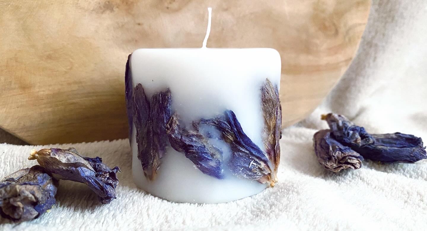Ručně vyrobená svíčka z Parafínového vosku obohacená o pravé sušené květy Ibišku.
