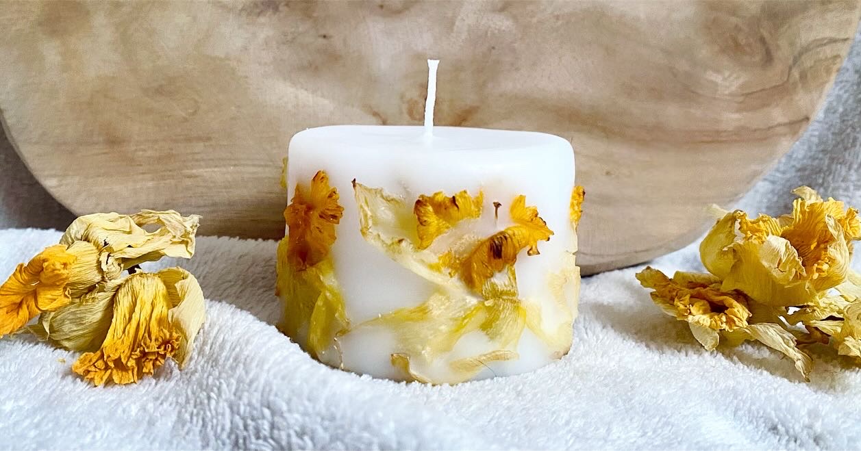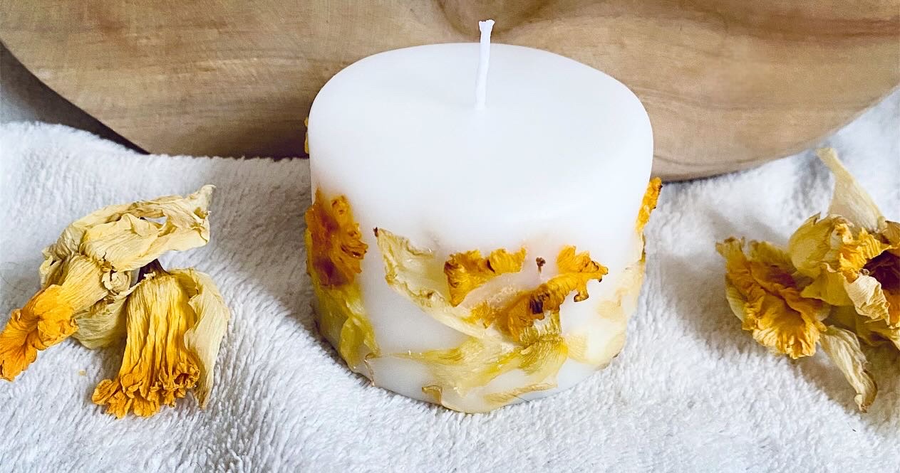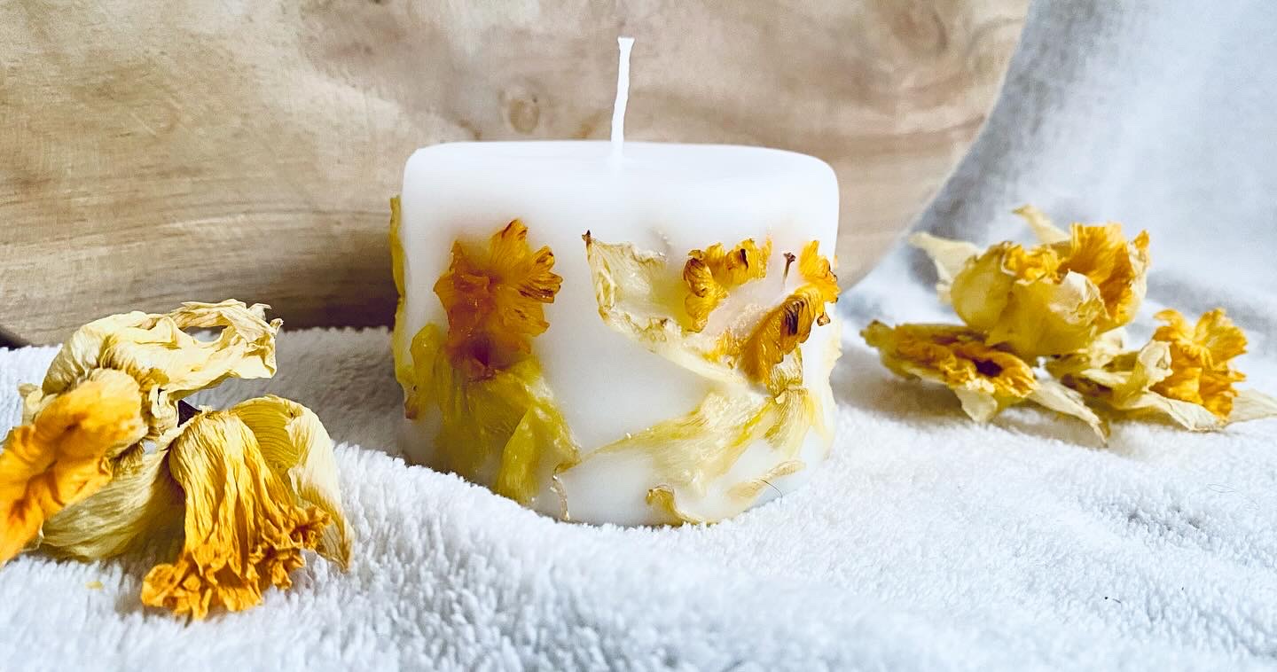 Ručně vyrobená svíčka z Parafínového vosku obohacená o pravé sušené květy Narcisu.