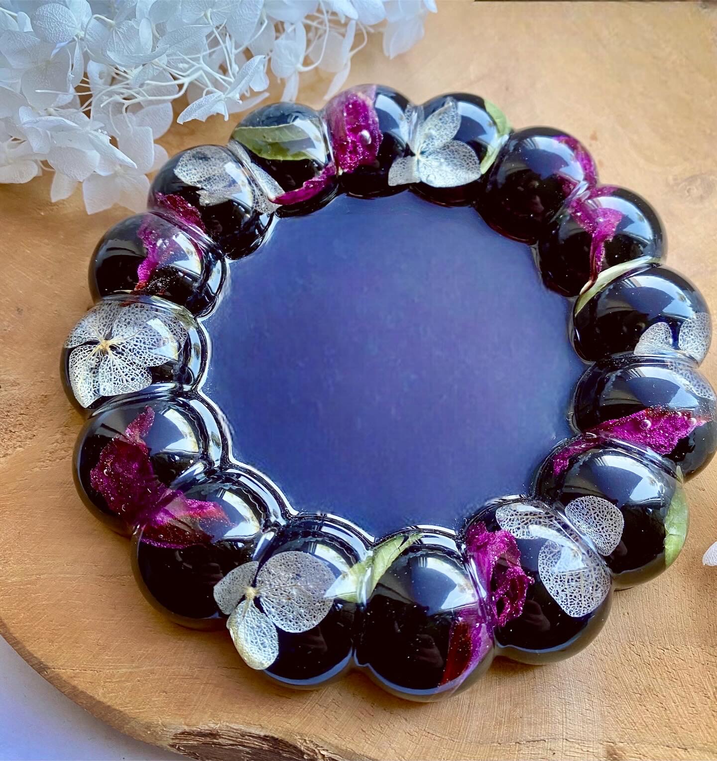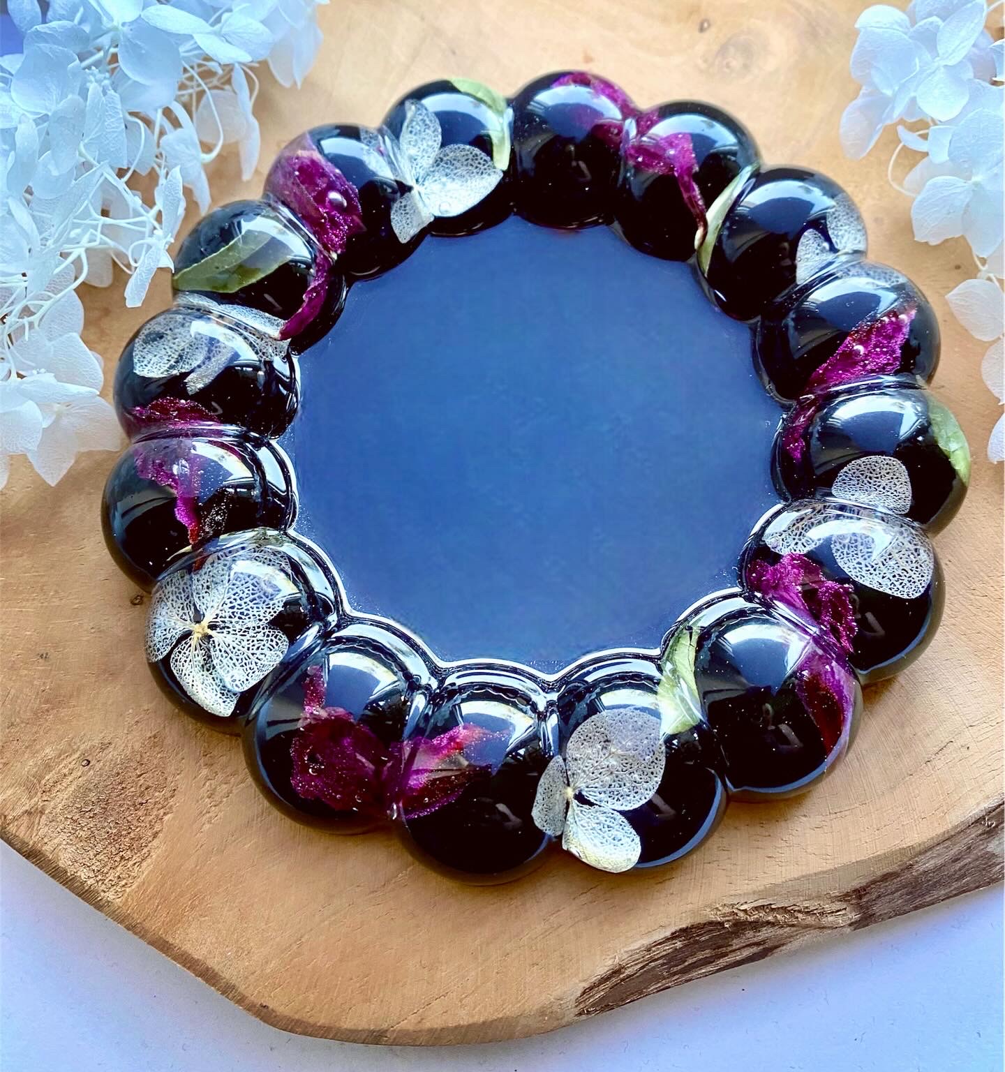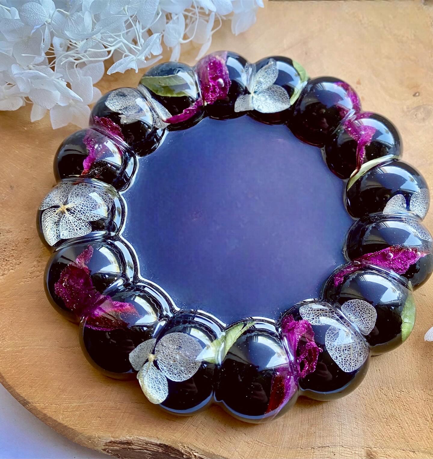 Podtácek s pravými sušenými květy podbarvené černou barvou.Velikost: 13 cm.