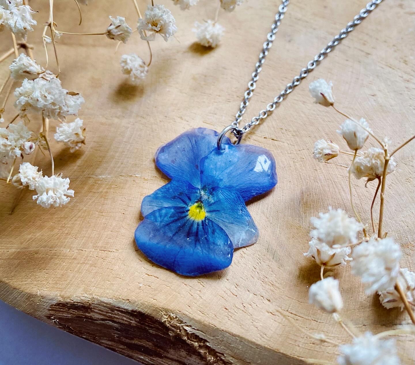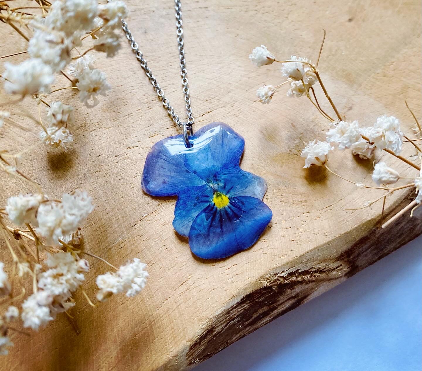 Přívěsek na řetízek s pravou sušenou Maceškou.Velikost: 3 cm.kruh: chirurgická ocel.