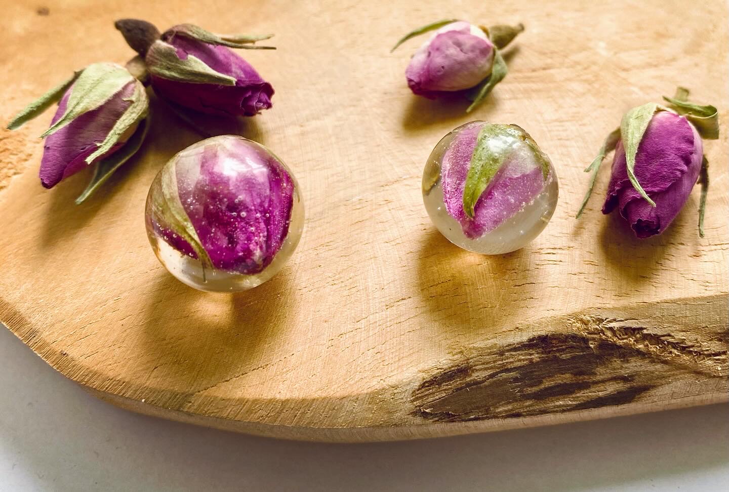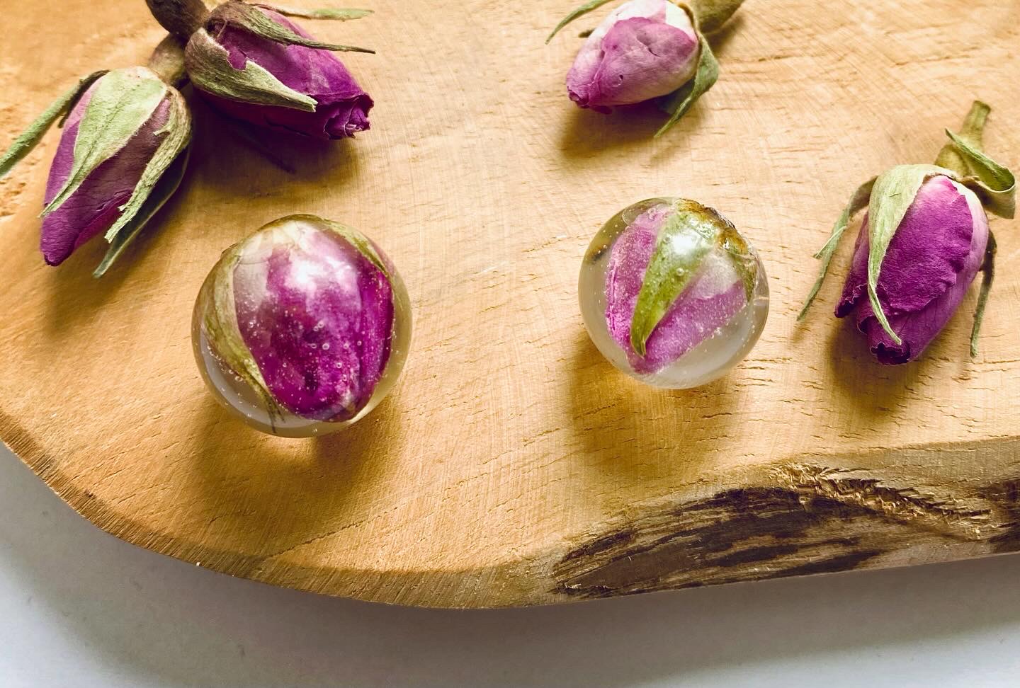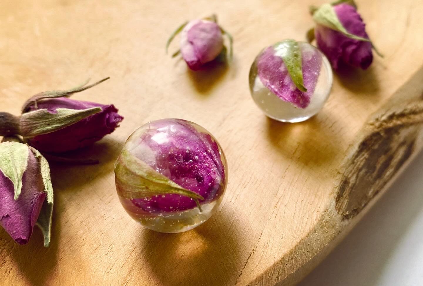 Přívěsek koule (vpravo) s pravým sušeným květem - poupě Růže.