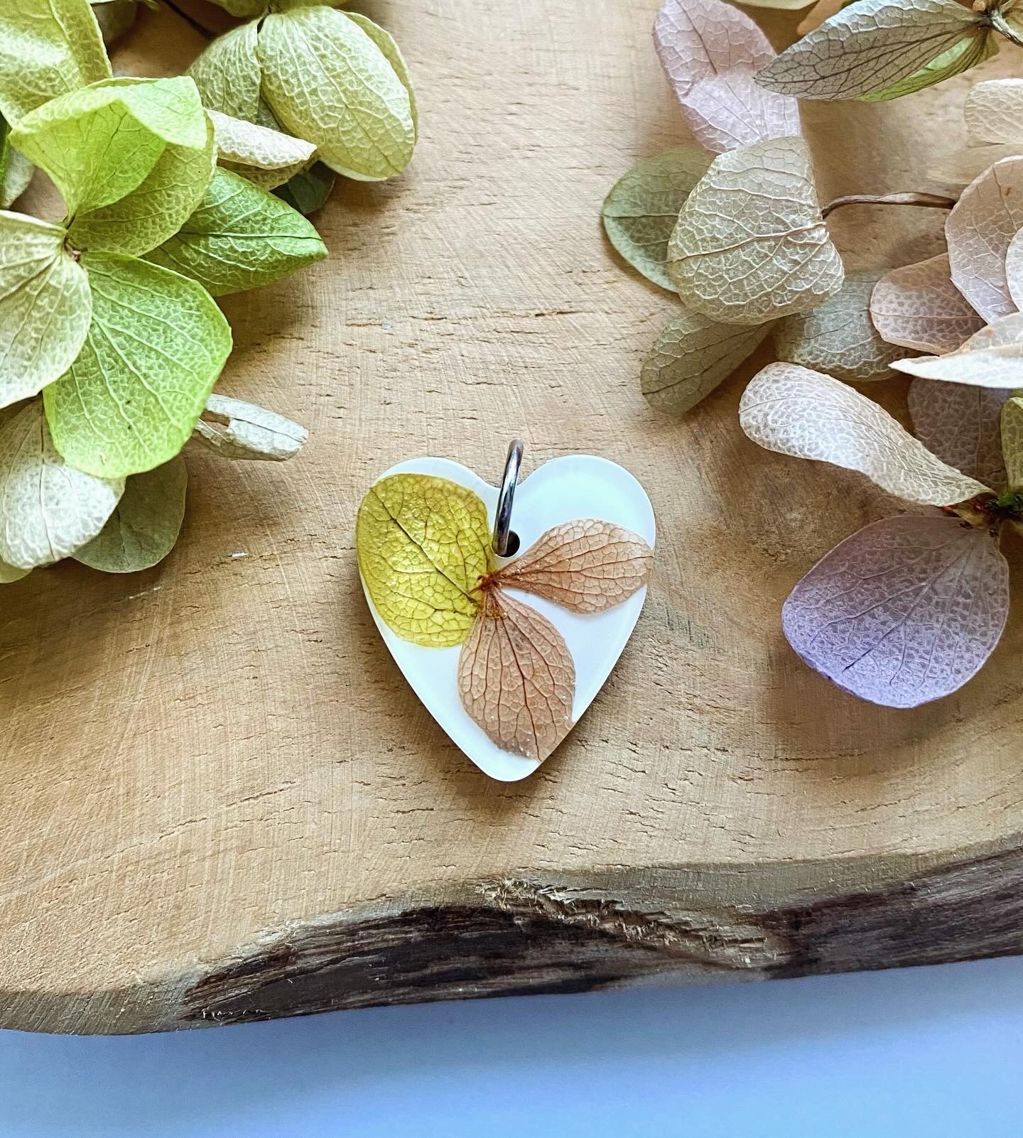 Přívěsek srdce s pravým sušeným květem Hortenzie.Velikost: 2,2 cm. Kroužek: Chirurgická ocel.