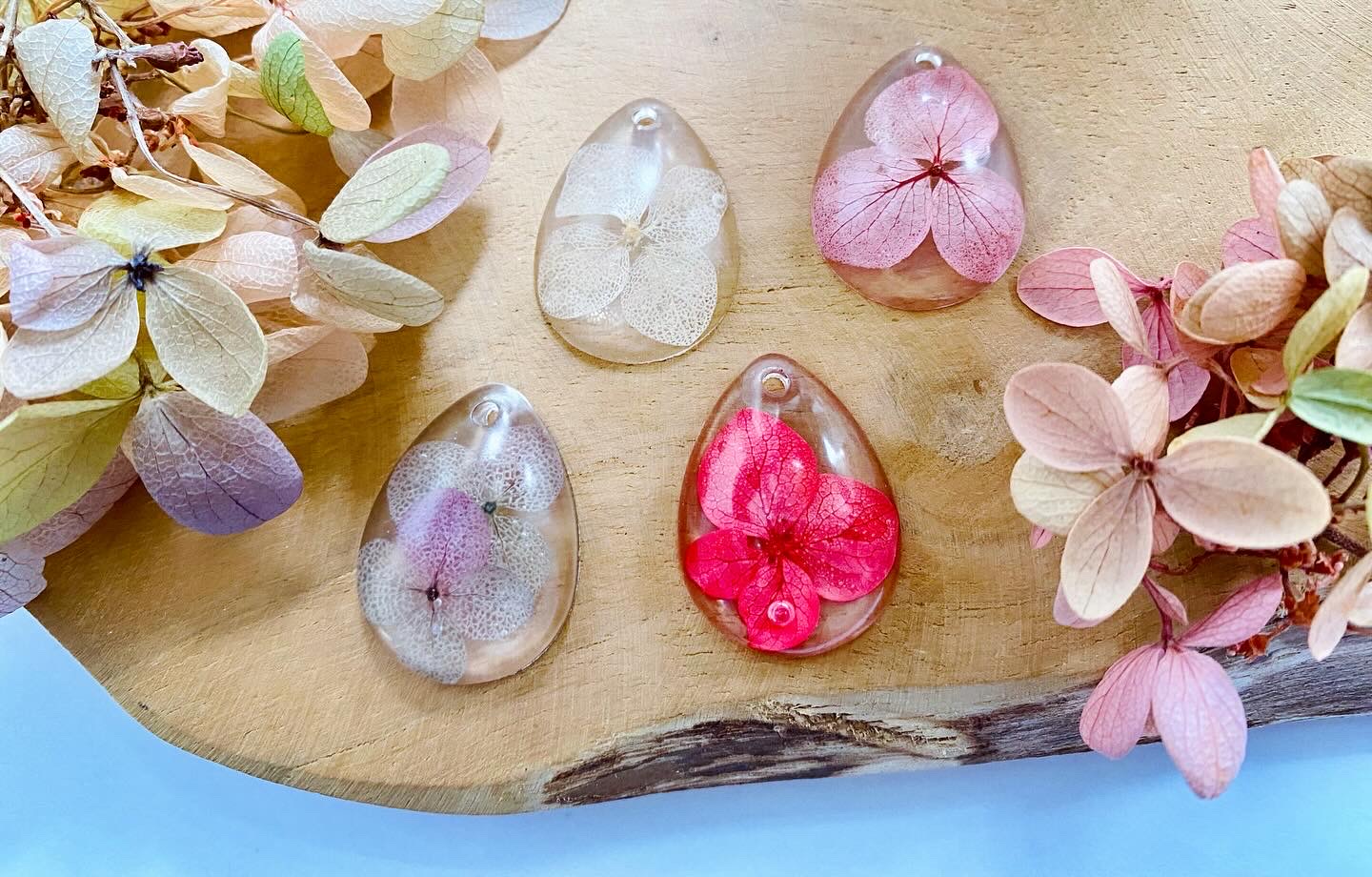 Přívěsek kapka s pravým sušeným květem Hortenzie.