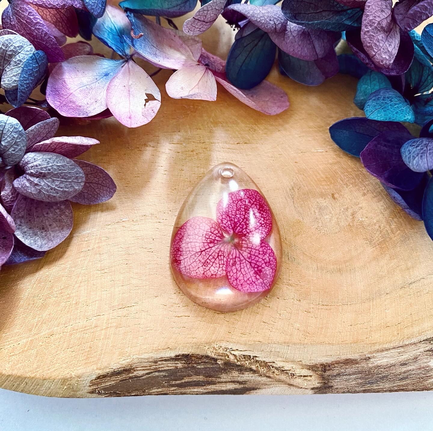 Přívěsek kapka s pravým sušeným květem Hortenzie.
