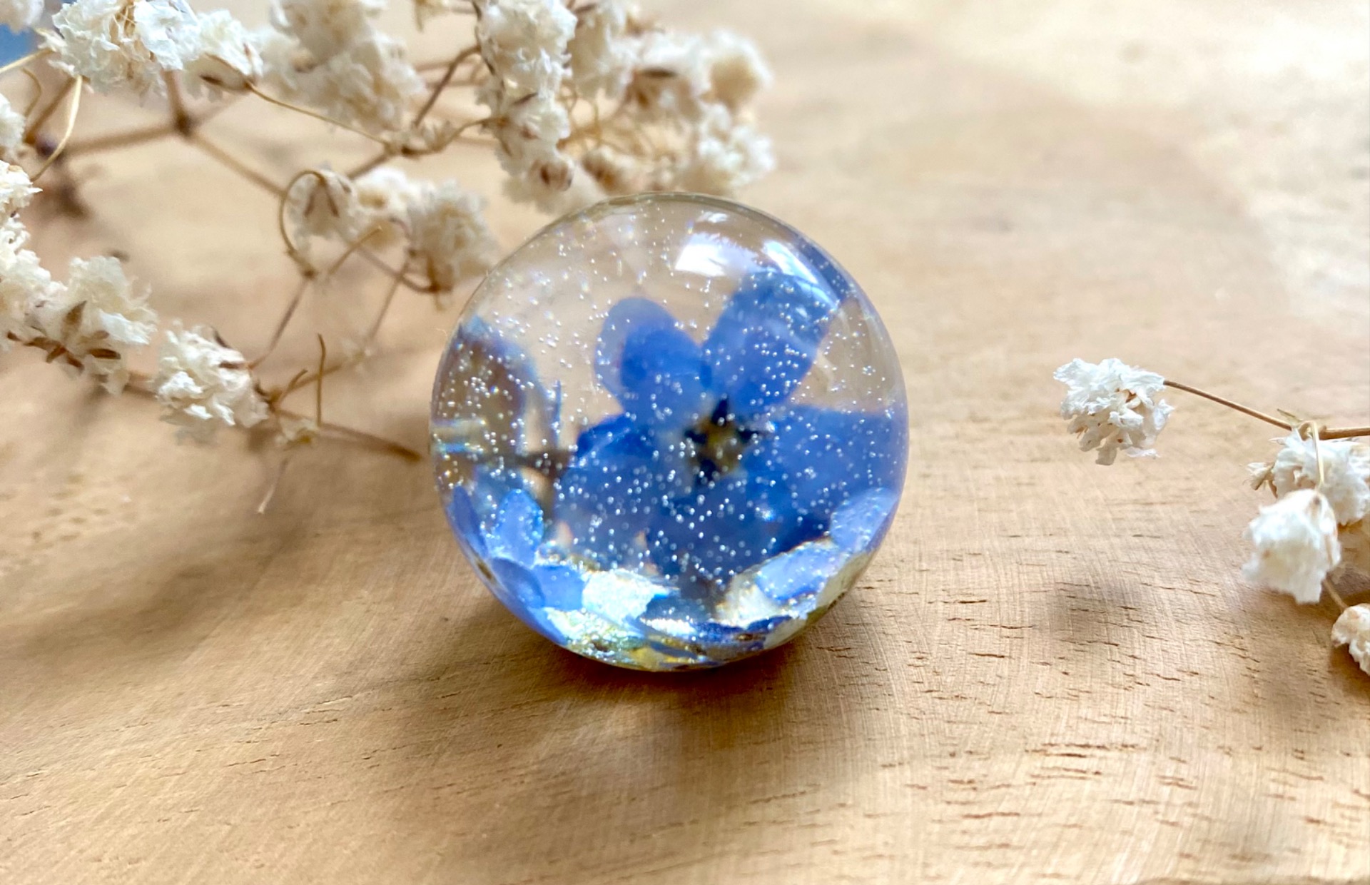 Přívěsek koule s pravými sušenými květy Tavolníku a Pomněnek.Velikost: 2,3 cm. Háček: Chirurgická ocel.